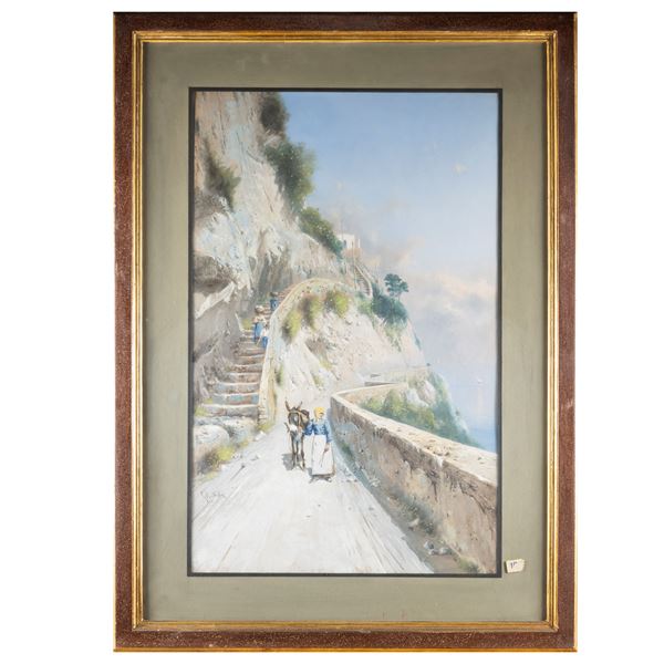 "Peasant and donkey on the panoramic road of the Amalfi coast", gouache on paper, signed lower left, within frame