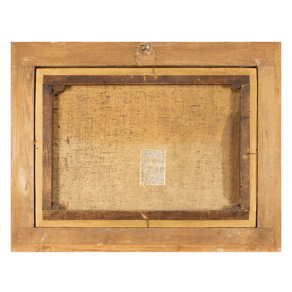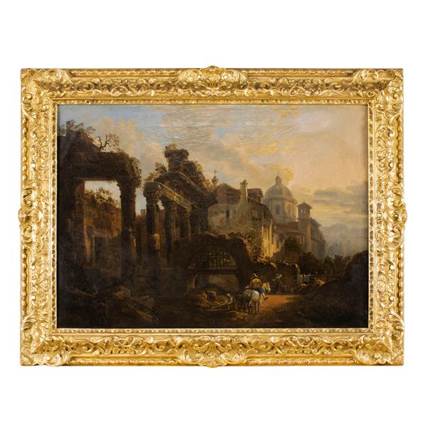 43x62.5 cm."View with classic ruins and figure on horseback", oil on canvas, initialled in the lower right, within frame