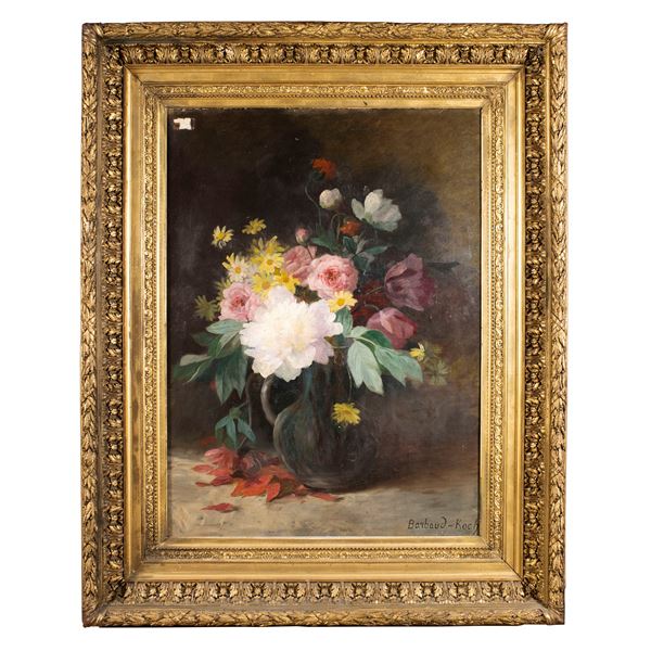 92x70 cm."Still life with flower vase", oil on canvas, within frame
