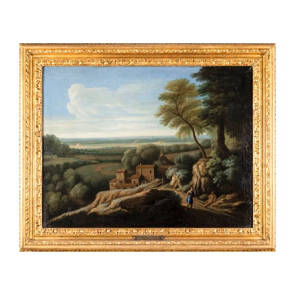 40x52.5 cm."Landscape with figures", oil on canvas, framed