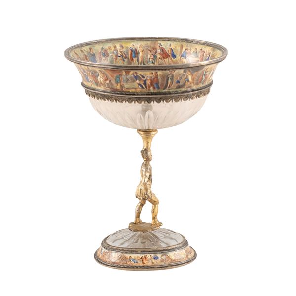 13.5x11.5x9.5 cm.oval base, stem shaped as a male figure in armor, cup and base in Rock crystal decorated with enamel depicting scenes taken from ancient Rome, slight wears