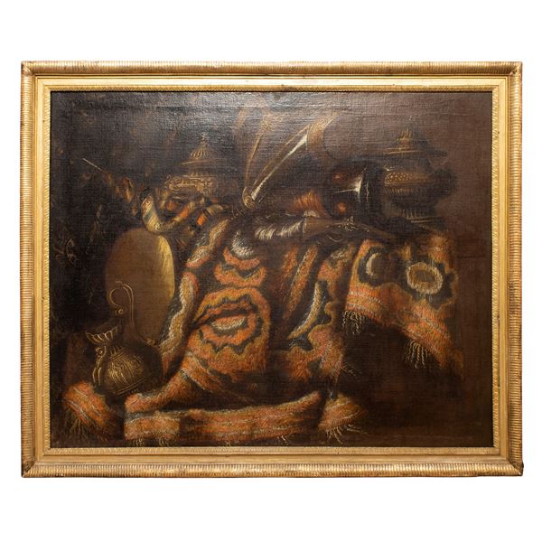102x126 cm."Still life with armour, carpet and pottery" oil on canvas, framed