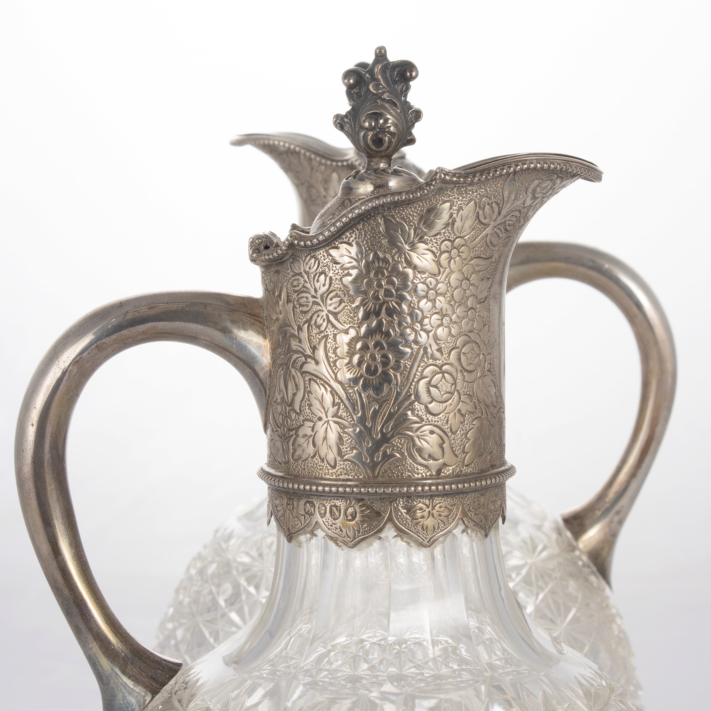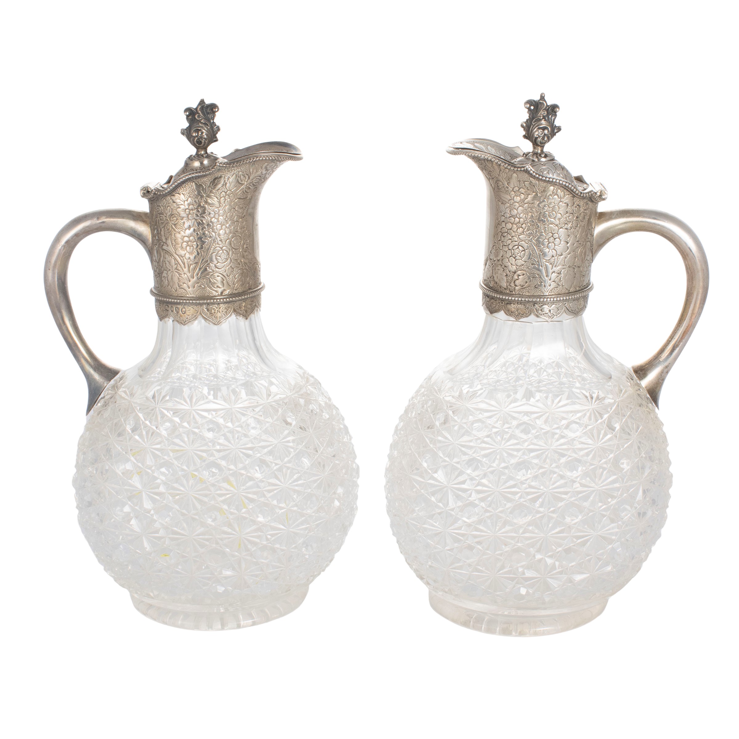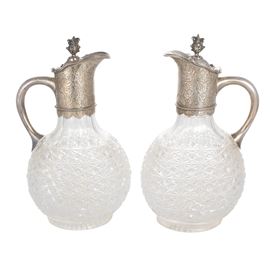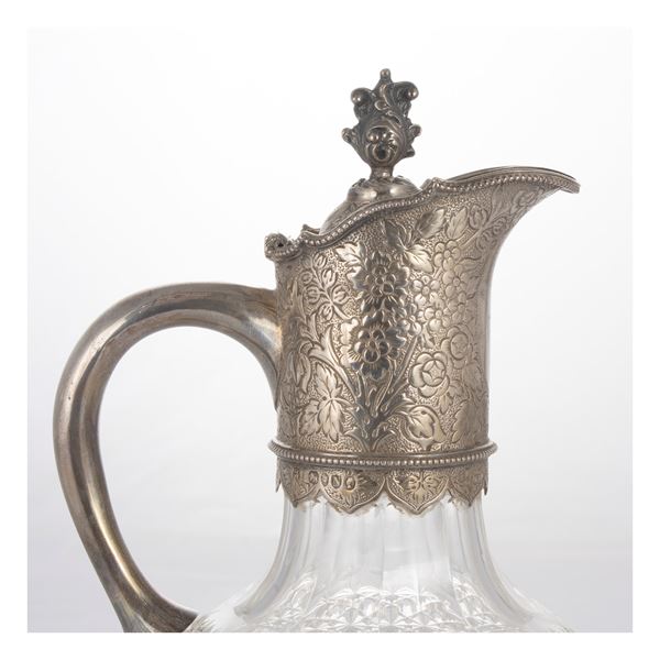 h. 27 cm.marks of Horace Woodward&Co -Edgar Finley & Hugh Taylor, cut crystal bodies with geometric motifs with frames, lids and spout in silver chiseled with vegetal motifs