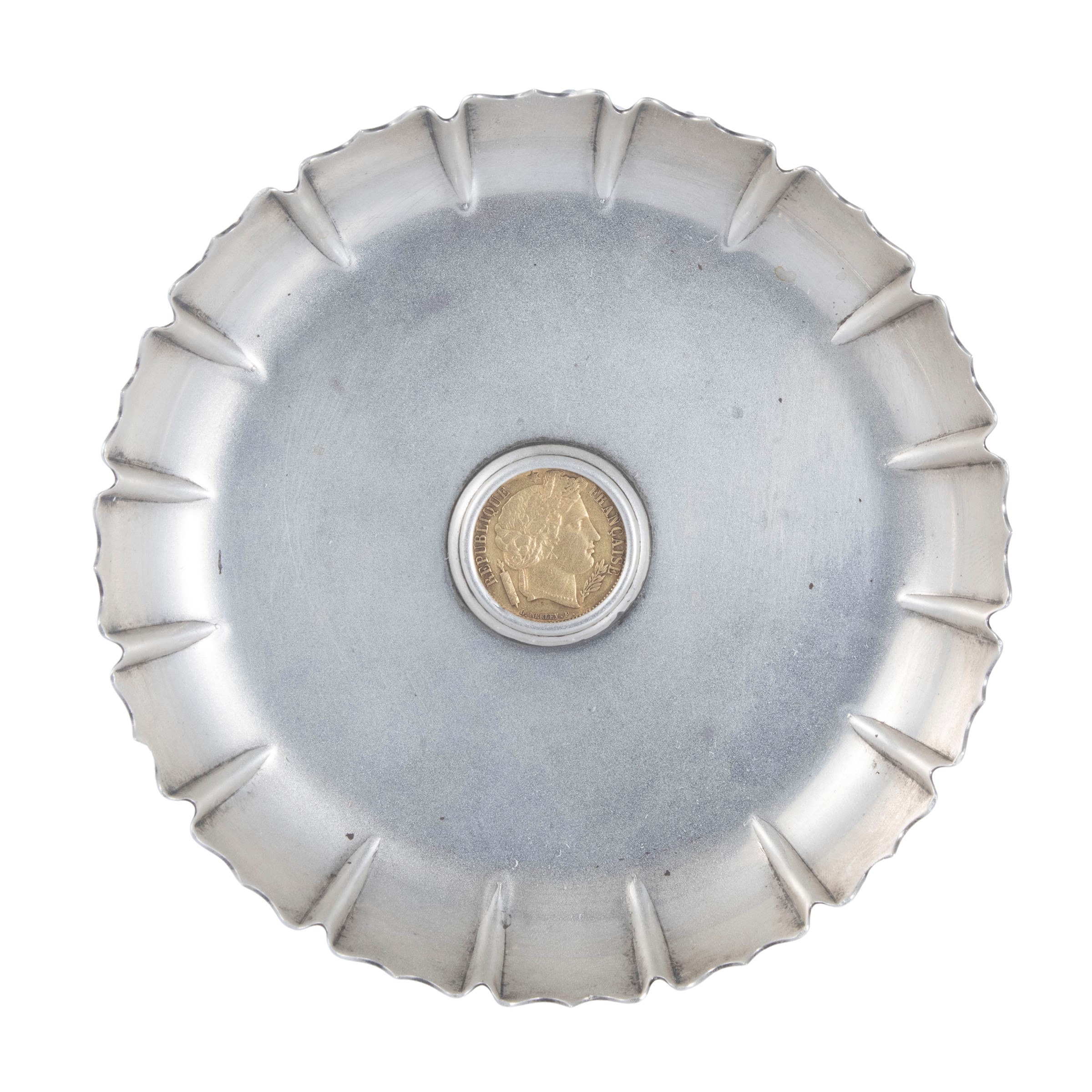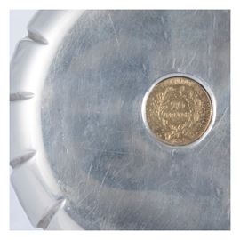 1,5x11.5 cm.circular shape in silver, a 20 French francs of 1851 in yellow gold is inserted in the center, depicting the profile of the republican Marianna, signed, weight 120 gr