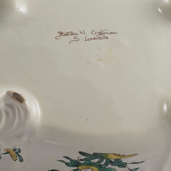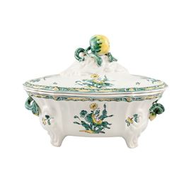 Polychrome ceramic bowl, lid with apple shaped grip, production brand
