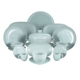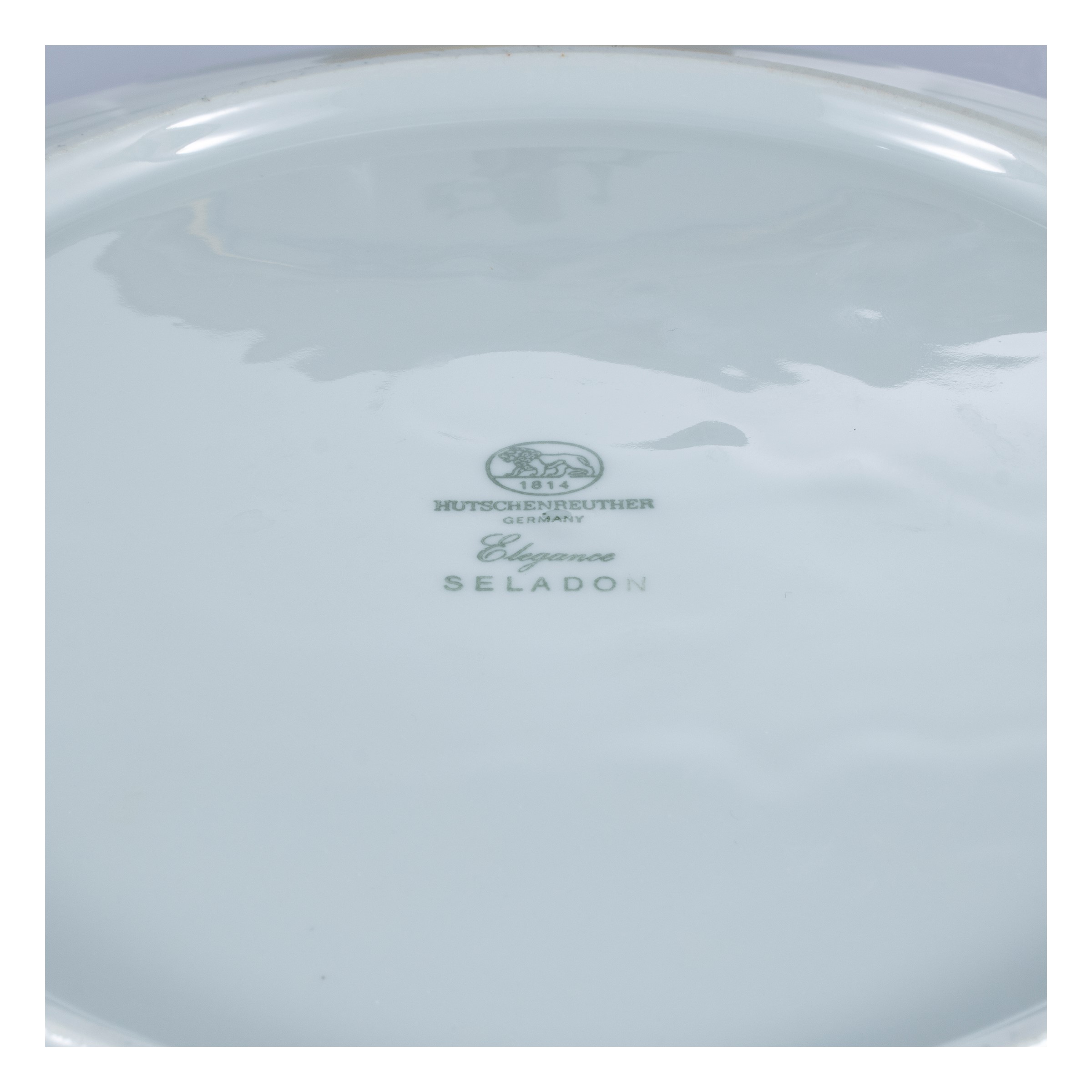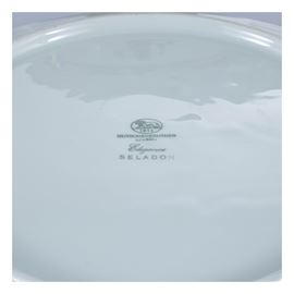 "Seladon" decoration in porcelain, production mark Comprising: 16 dinner plates d. 25.5 cm. 7 soup plates d. 22 cm. 16 fruit plate d. 20 cm. a sugar bowl 18x29.5x23 cm. 2 salad bowls maximum size 9.5x22 cm. 1 hors d'oeuvre plate 21.5x13 cm. a gravy boat 8x16.5 cm 4 oval serving plates maximum size 32x22 cm. 3 circular serving plates maximum diameter 33.5 cm. 12 broth cups h. 5.5 cm. with 12 saucers d. 16.5 cm. 10 coffee cups h. 5.5 cm. with 10 saucers d. 12 cm.