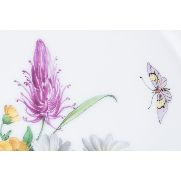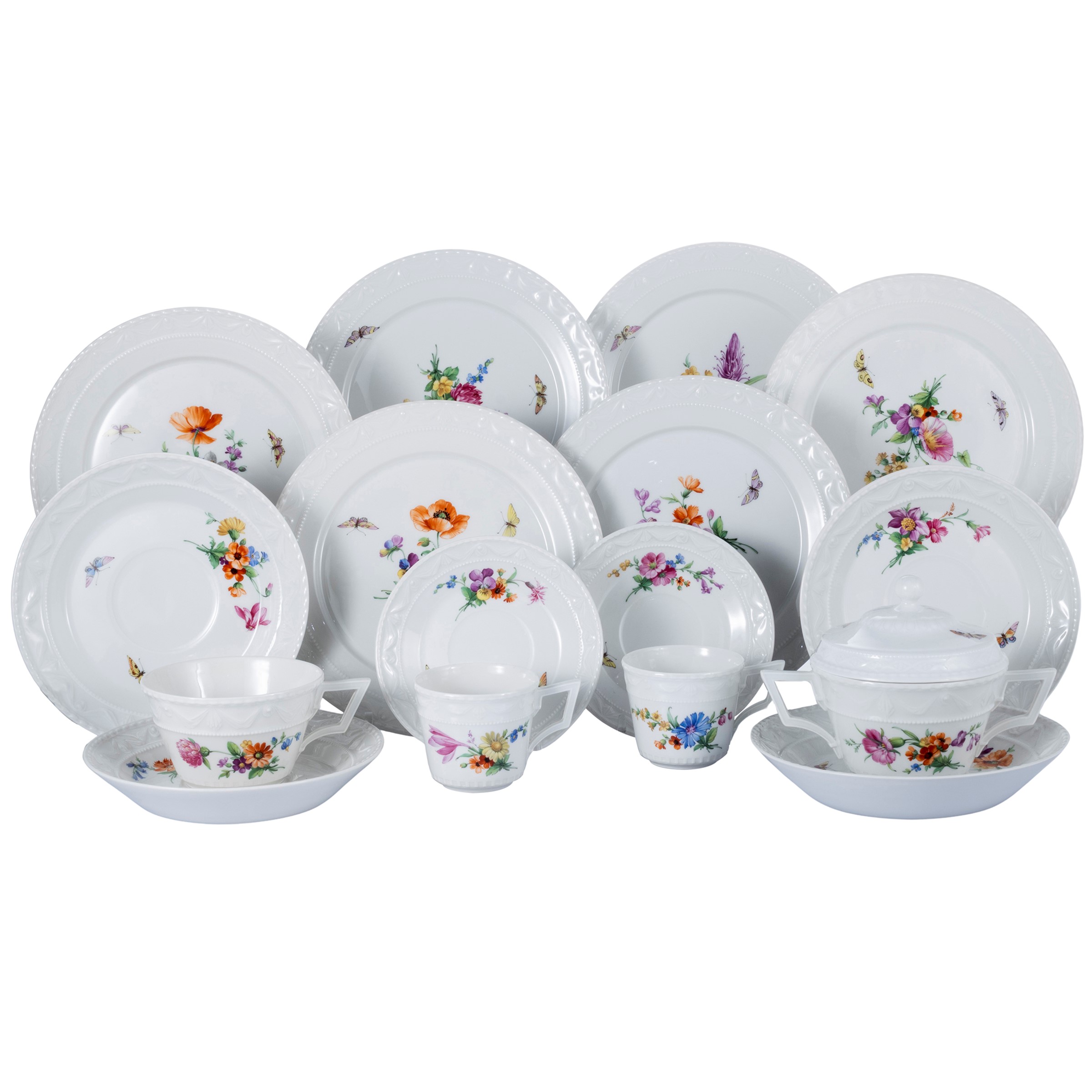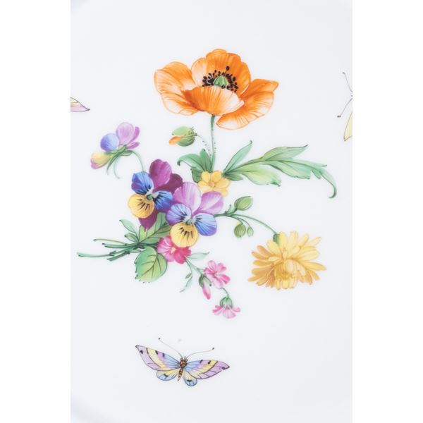In porcelain decorated with butterflies and floral motifs on a white background, profile due to festoons, production brand. Comprising: 10 broth cups h. 11 cm. with 10 saucers d. 16 cm. 8 coffee cups h. 5.5 cm. with 8 saucers d. 12 cm. 9 tea cups h. 5.5 cm. with 9 saucers d. 15.5 cm. 10 dessert plates d. 19.5 cm.