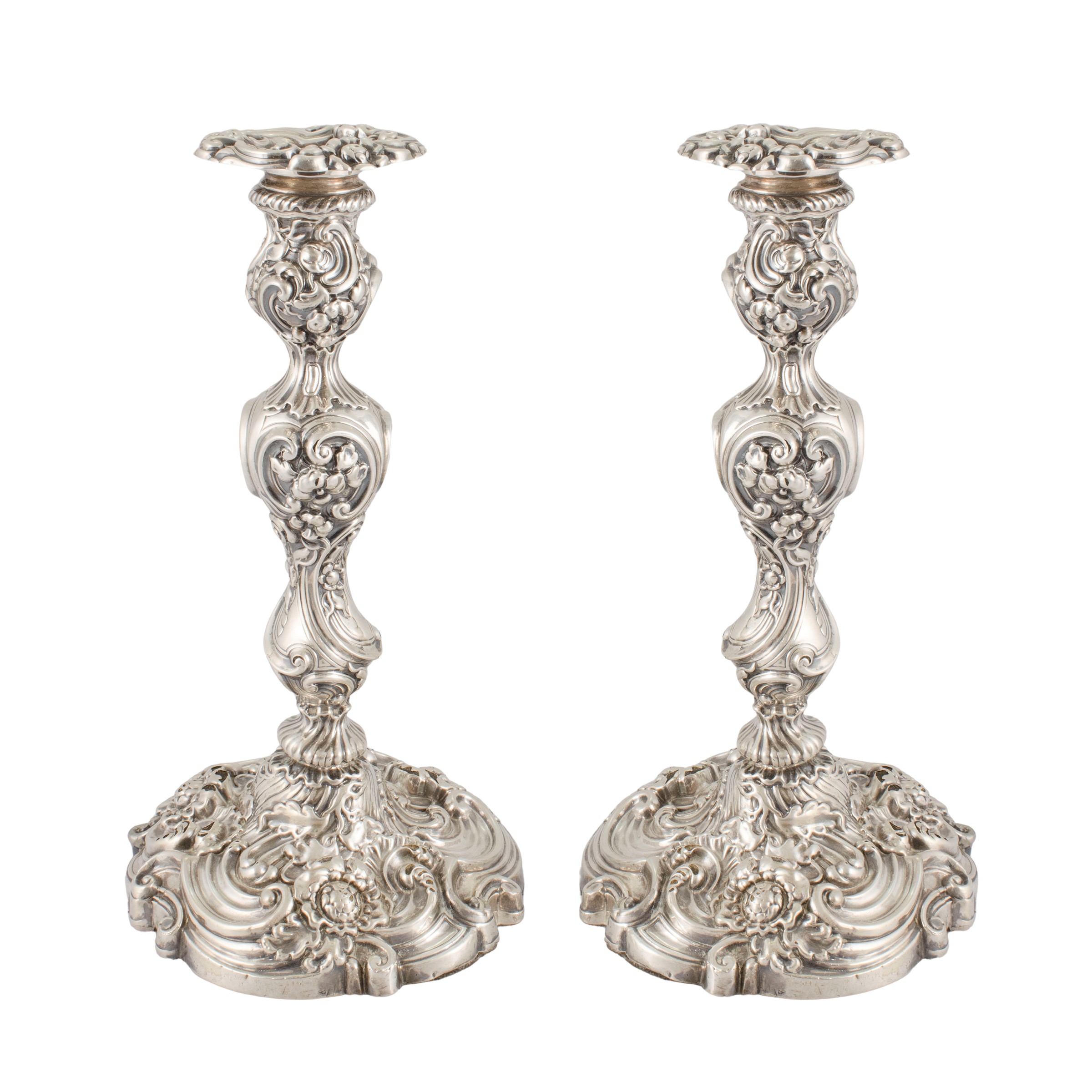 chiseled with floral and vegetal motifs, resting on a circular base with shaped profile, baluster stem, wears, total gross weight 2280 gr