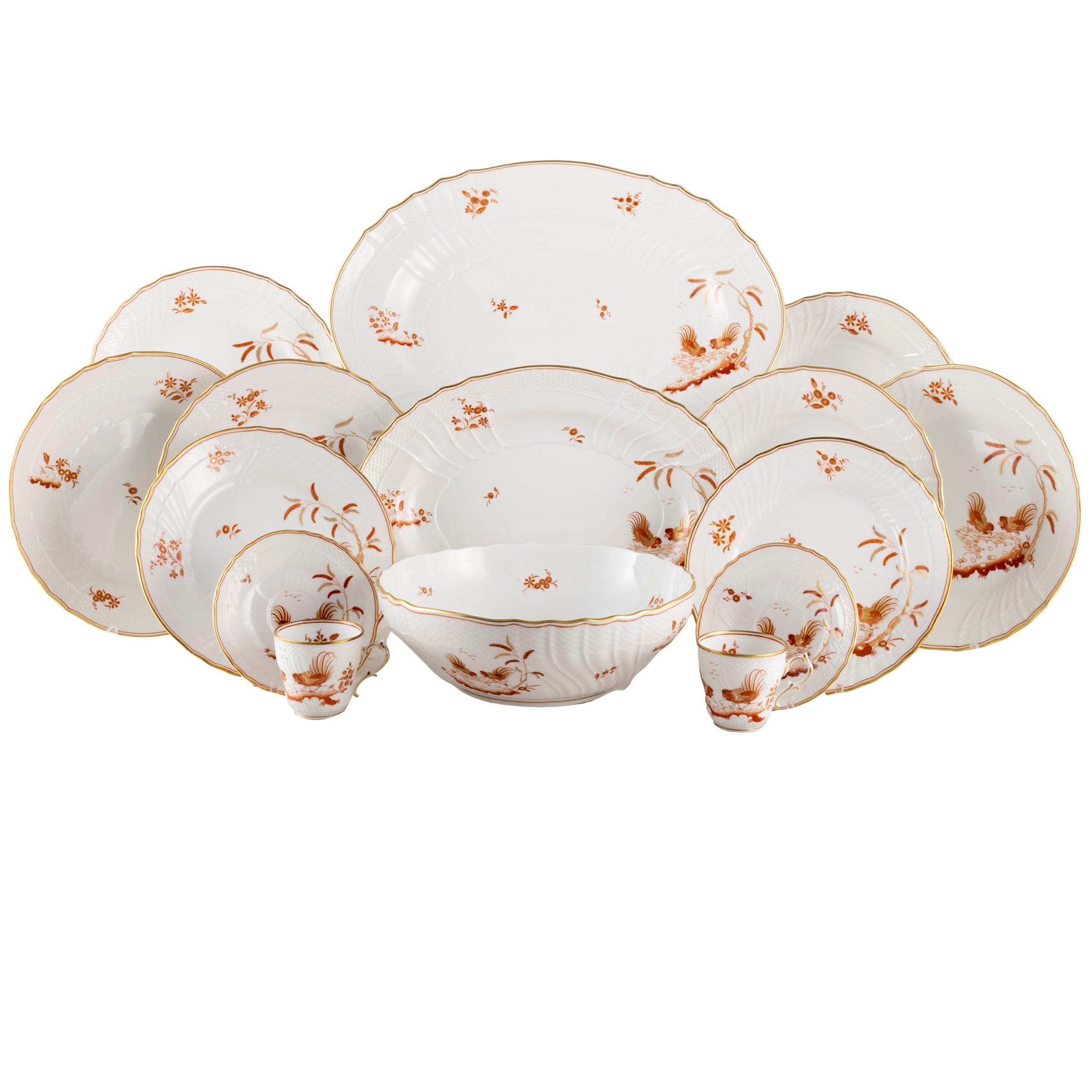 "Galli Rossi" decoration in polychrome porcelain on a white background, Ozier edge and golden profile, production mark Comprising: 36 dinner plates d. 24.5 cm. 12 soup plates d. 23 cm. 16 fruit plates d. 21.5 cm. 20 dessert pltes d. 19.5 cm. a salad bowl 8.5x24.5 cm 2 oval serving plates maximum size 42.5x30.5 cm. 7 circular serving plates d. 26.5 cm. 10 coffee cups h. 5.5 cm. with 10 saucers d. 13 cm.
