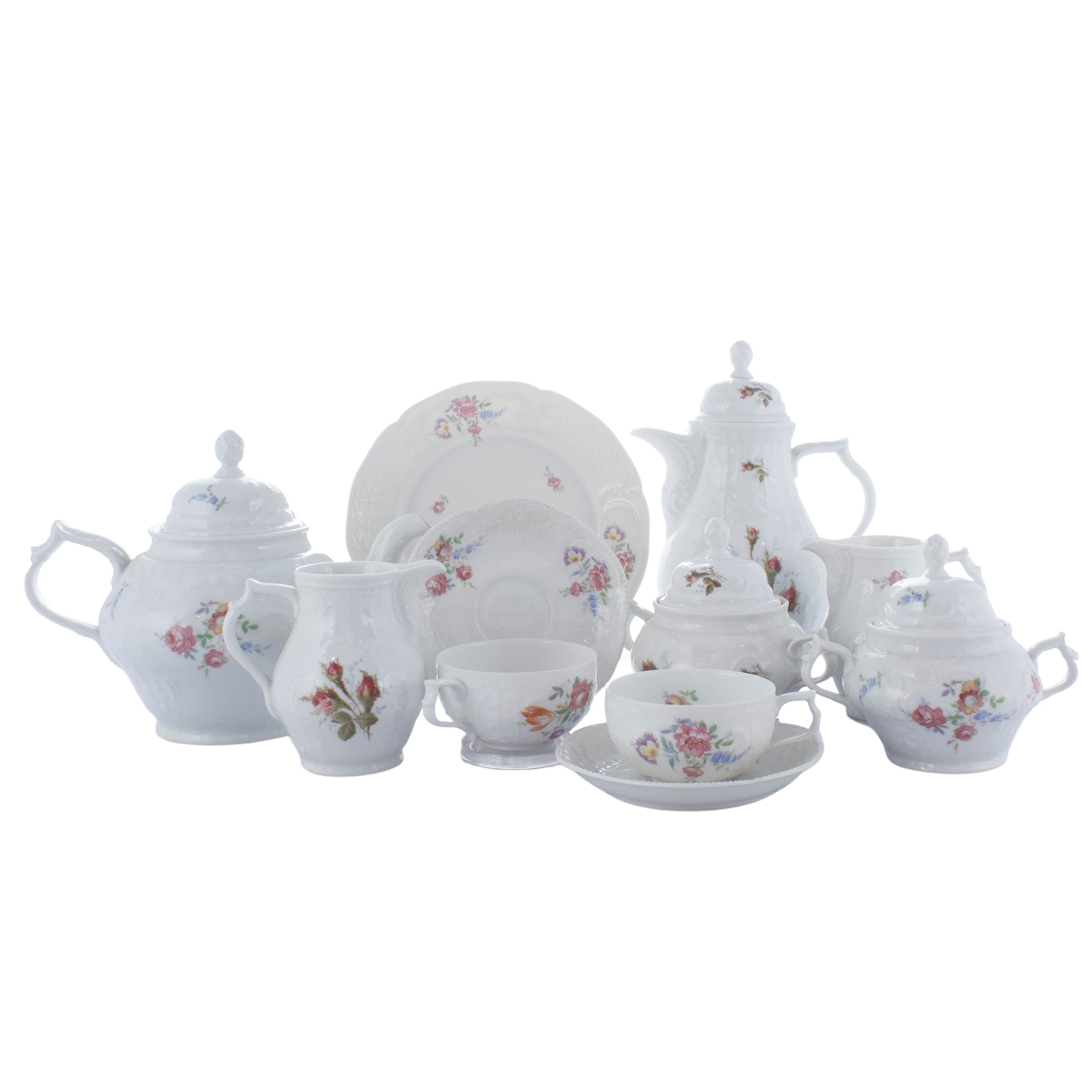 "Sanssouci" model in white porcelain with polychrome decoration with floral motif, production mark. Comprising: 12 tea cups h. 5 cm. with 12 saucers. 14.5 cm. 11 coffee cups h. 6 cm. with 11 saucers d. 11 cm. 2 sugar bowls h. 13 cm. 2 milk jugs h. 11.5 cm. 12 dessert plates d. 20 cm. a teapot h. 19 cm. a coffee pot h. 24.5 cm.