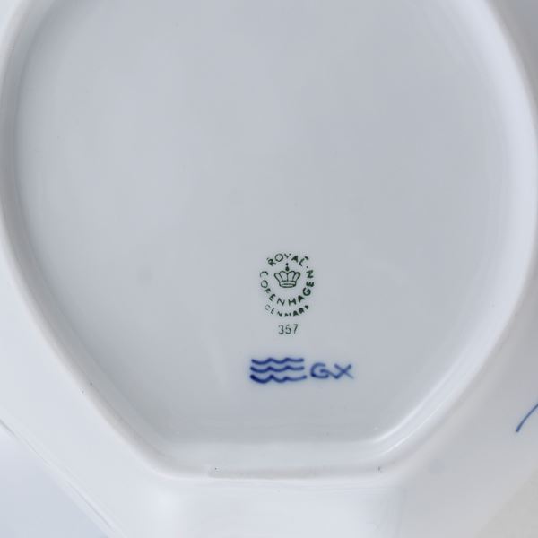 "Blue flower curved" decoration, in cobalt blue porcelain on a white background, Ozier edge, production brand, within original boxes Comprising: 12 dinner plates d. 26cm. 12 soup plates d. 22cm. 12 fruit plates d. 21cm. a soup tureen 19x34x22 cm. a salad bowl 10x23 cm 2 oval serving plates 36x28 cm. each 2 leaves 23x18 cm.