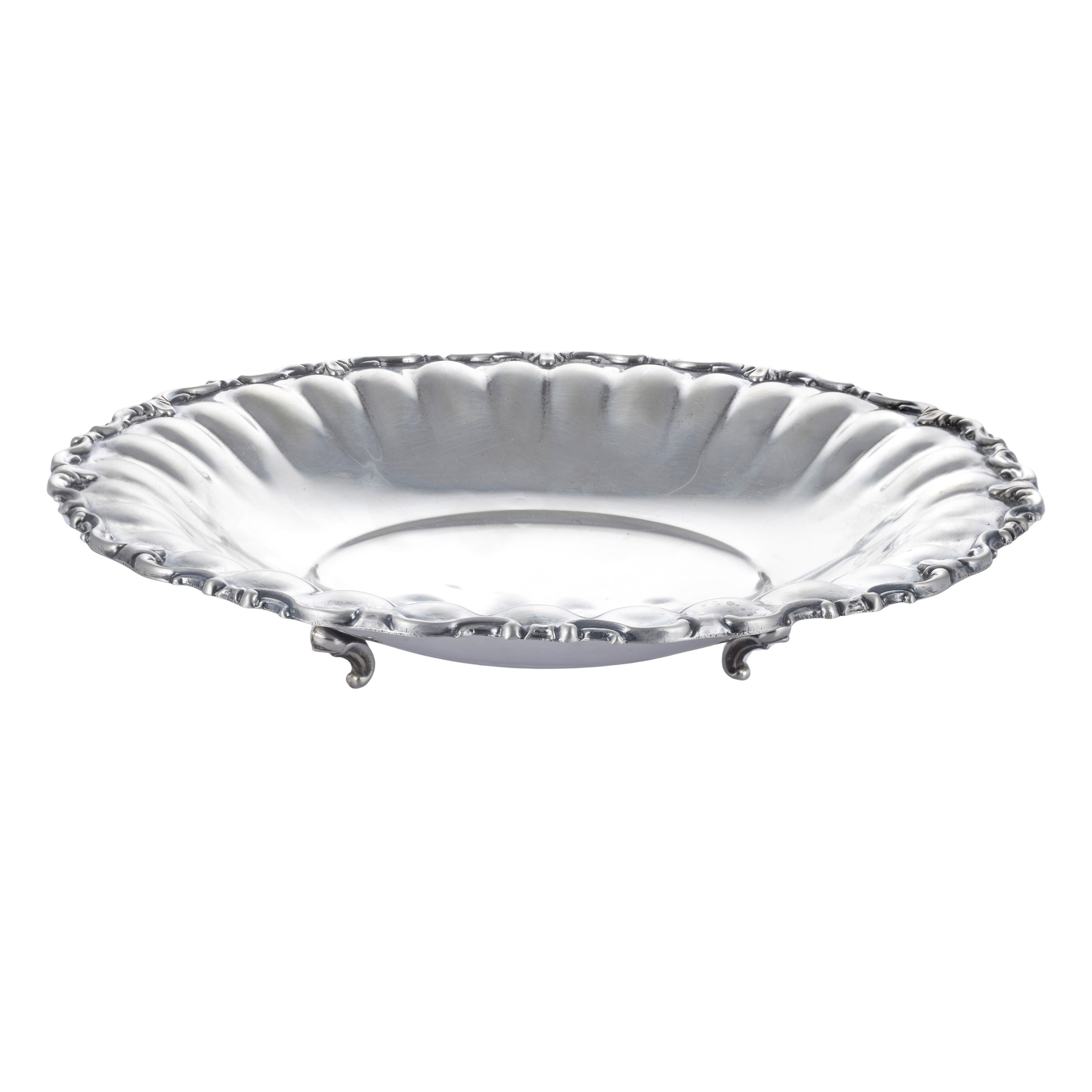 circular shape with shaped border resting on three feet, weight 245 gr