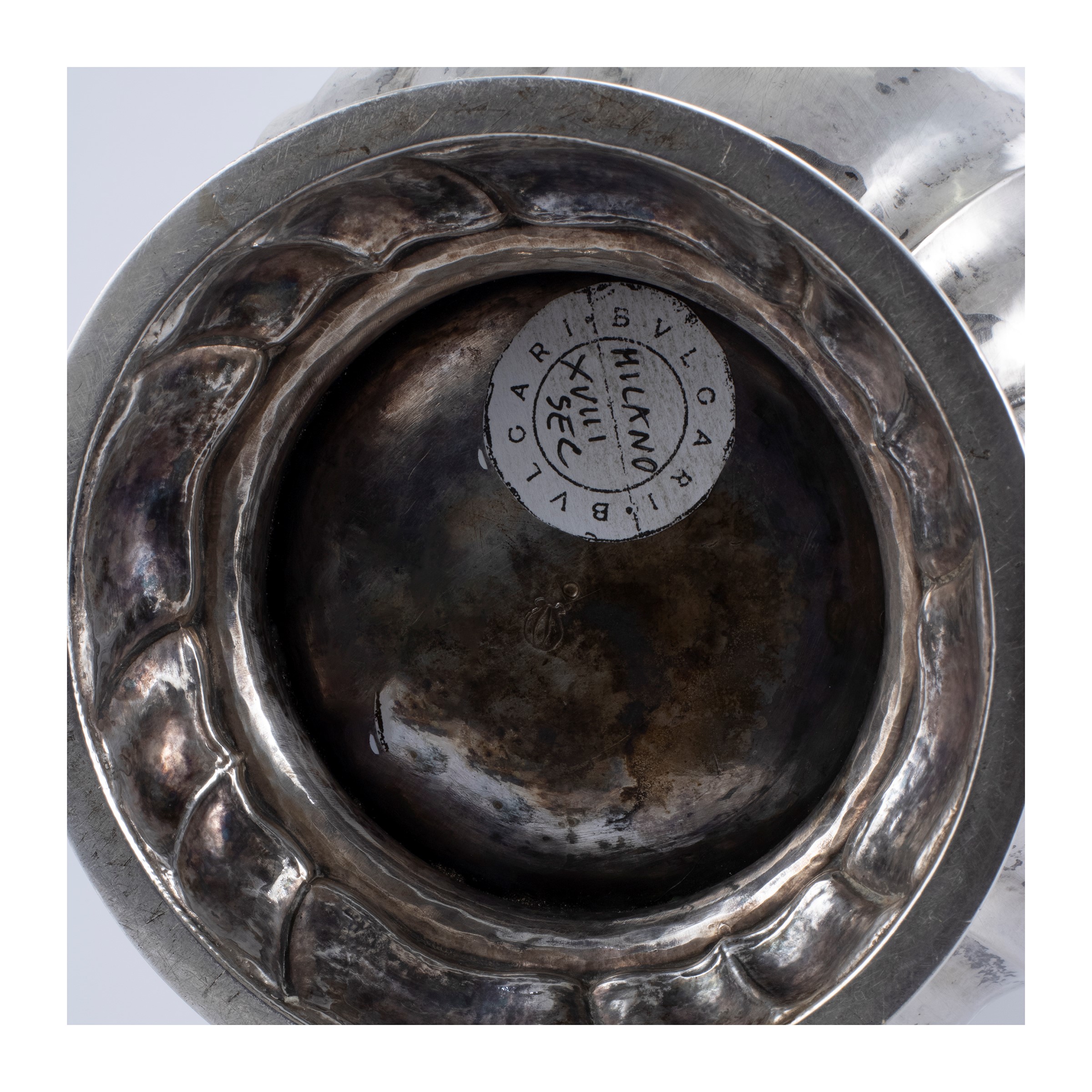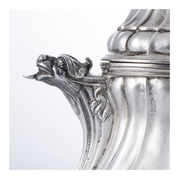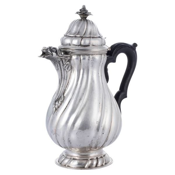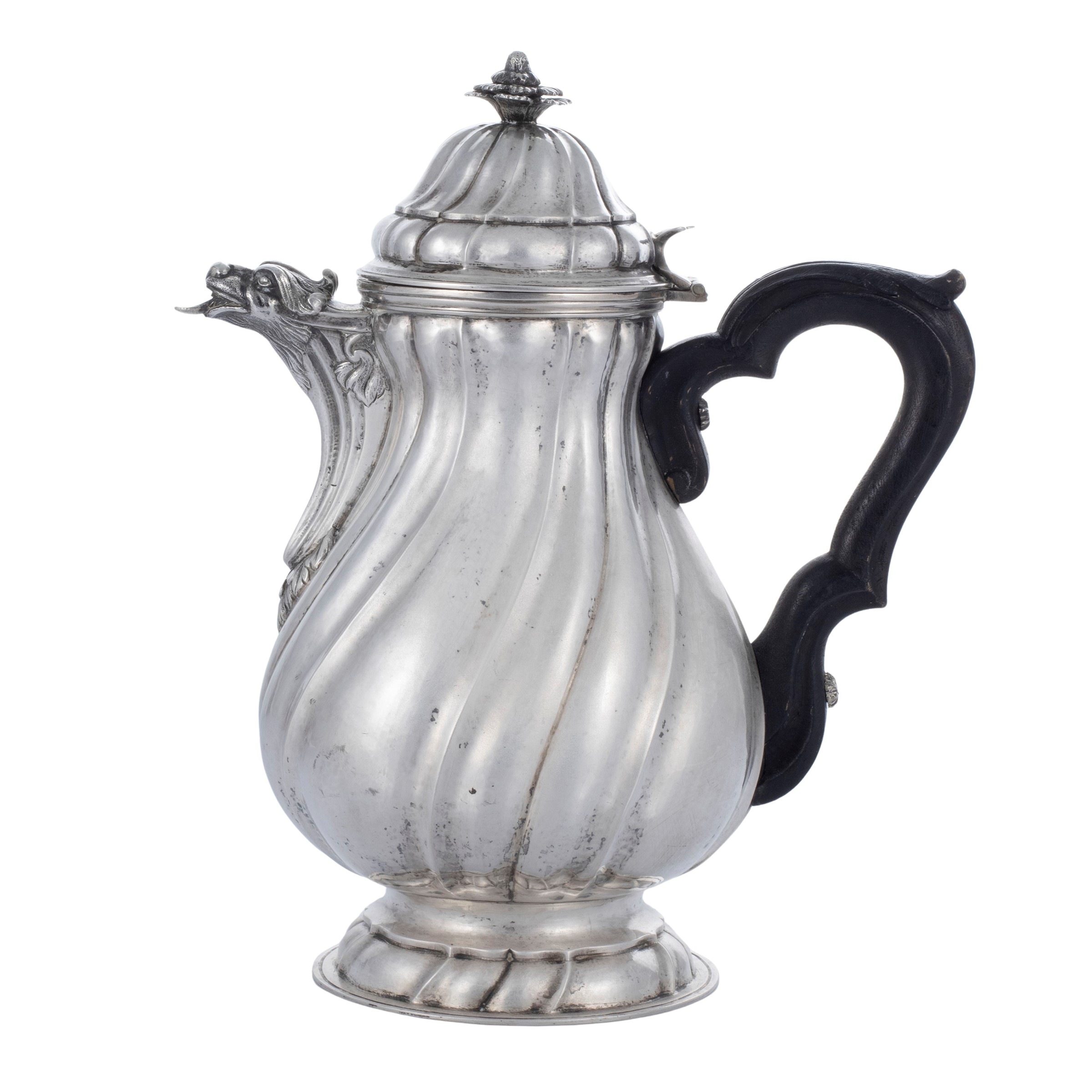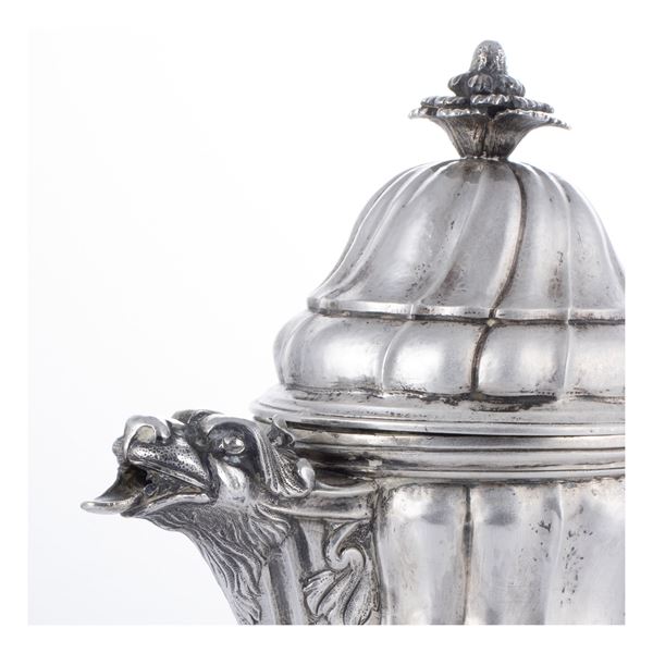 torchon body on a circular base, zoomorphic spout, wood handle, lid with floral motif, wears, weight 1073 gr