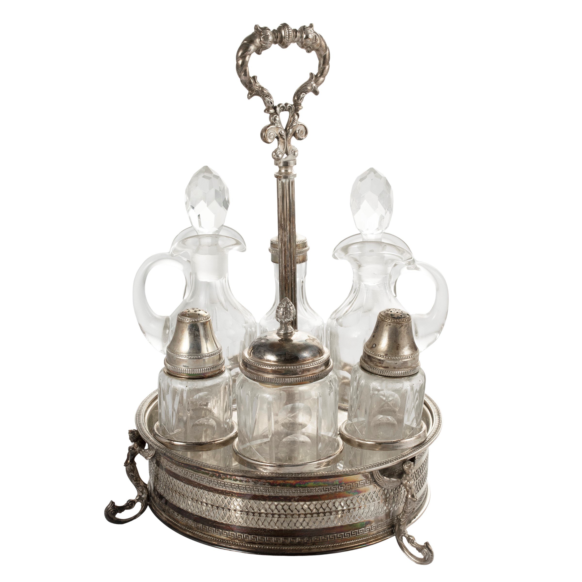 27x18 cm.marks of Rino Greggio, circular base resting on three feet, stem with double volute grips, cut glass and silver ampoules, slight defects, weight 500 gr