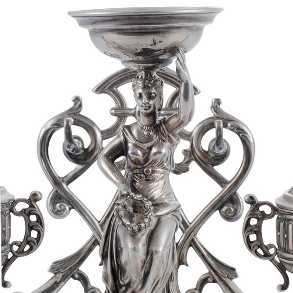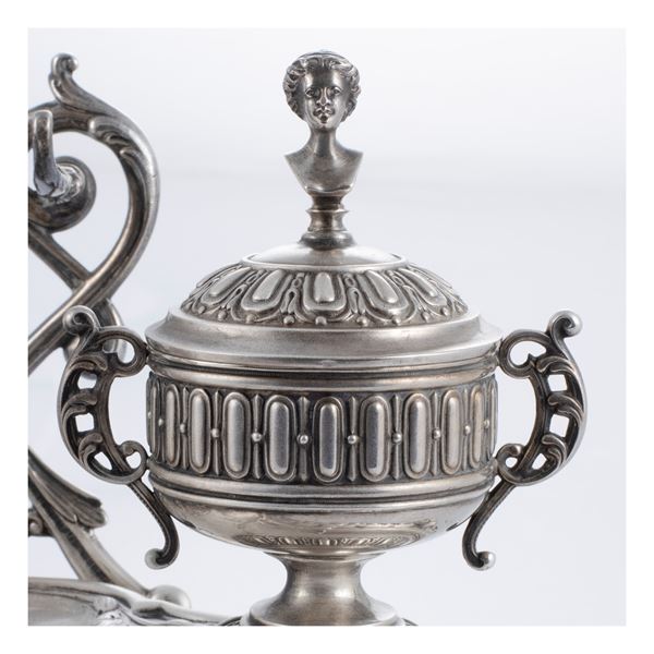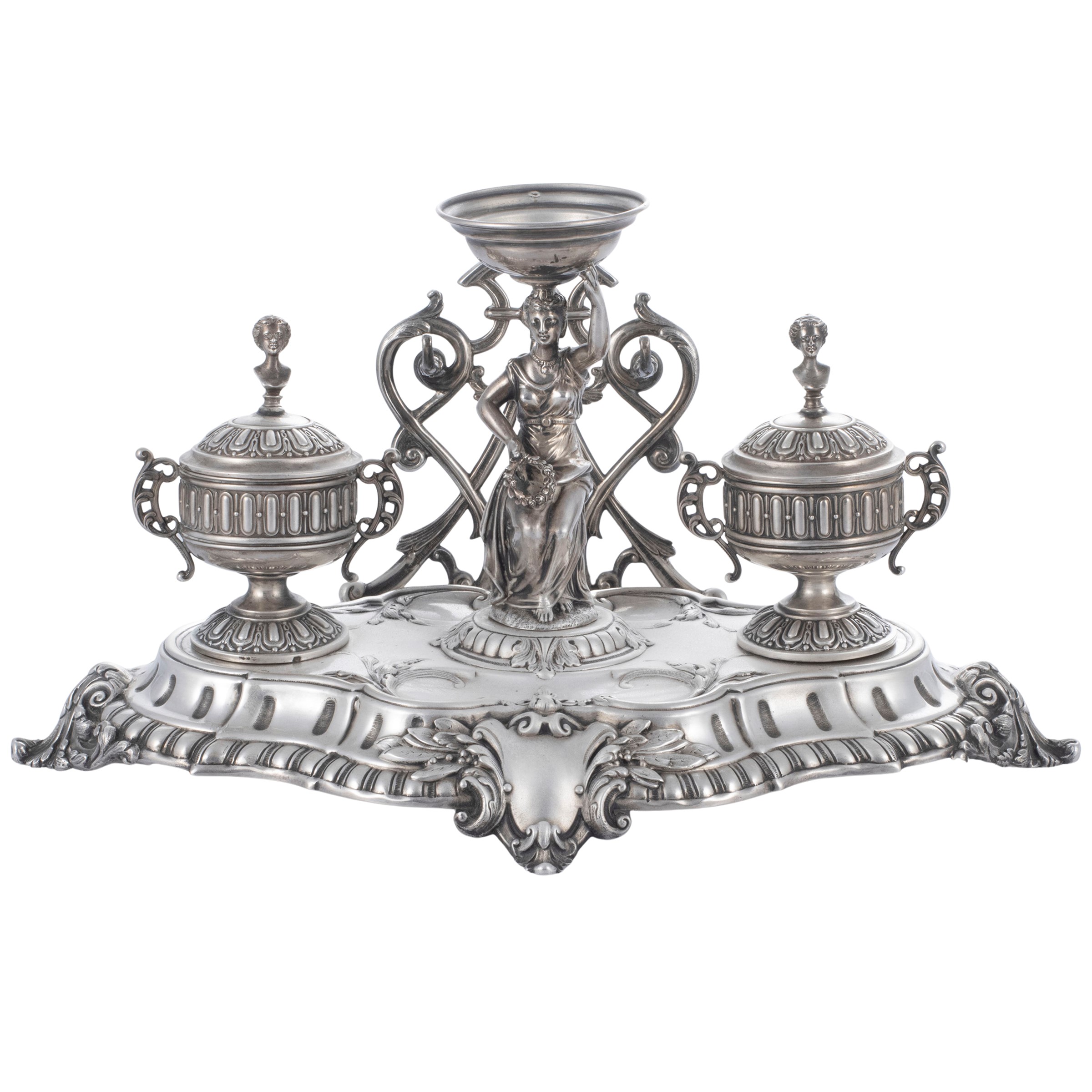 17.5x31x20 cm.shaped body resting on four feet, centered by a female figure sitting with a laurel wreath in the hands and cup on the head, on the sides two containers, pen holder, weight 776 gr