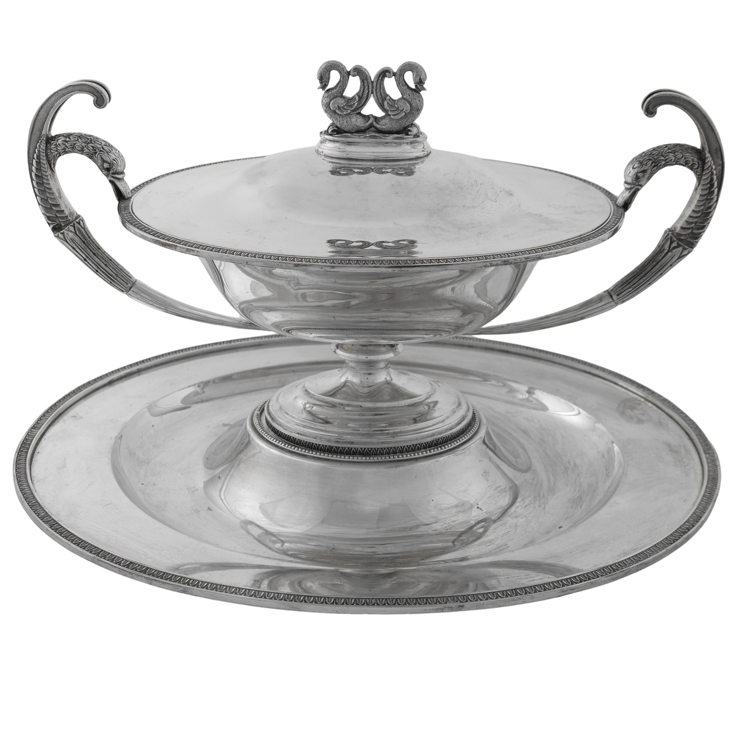 marks of Francesco Caputo, Milan, plain body with Empire palmette profiles, oval shaped handles with bird head terminal, swan shaped lid grip, weight 1830 gr