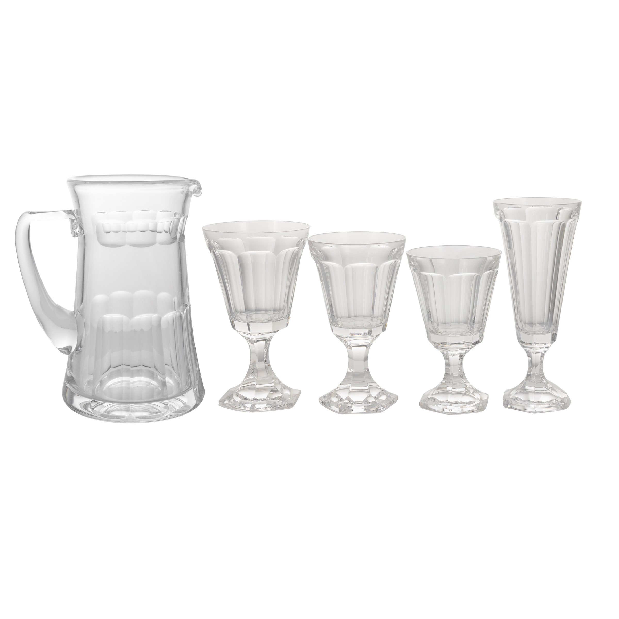 in transparent crystal on a hexagonal basis, production mark comprising: 12 water glasses h. 15 cm. 10 white wine glasses h. 14 cm. 12 red wine glasses h. 13 cm. 12 flutes h. 17.5 cm. a carafe h. 20.5 cm.