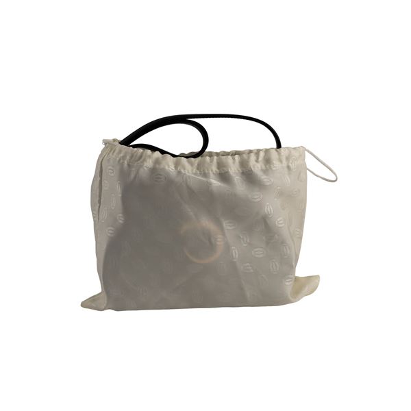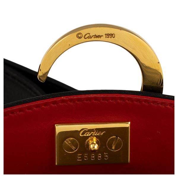 17x13x6 cm.black leather, golden finishes, red leather interior with a hinge pocket, adjustable and removable shoulder strap, pressure flap with a panther, complete with dust bag, some signs of wear