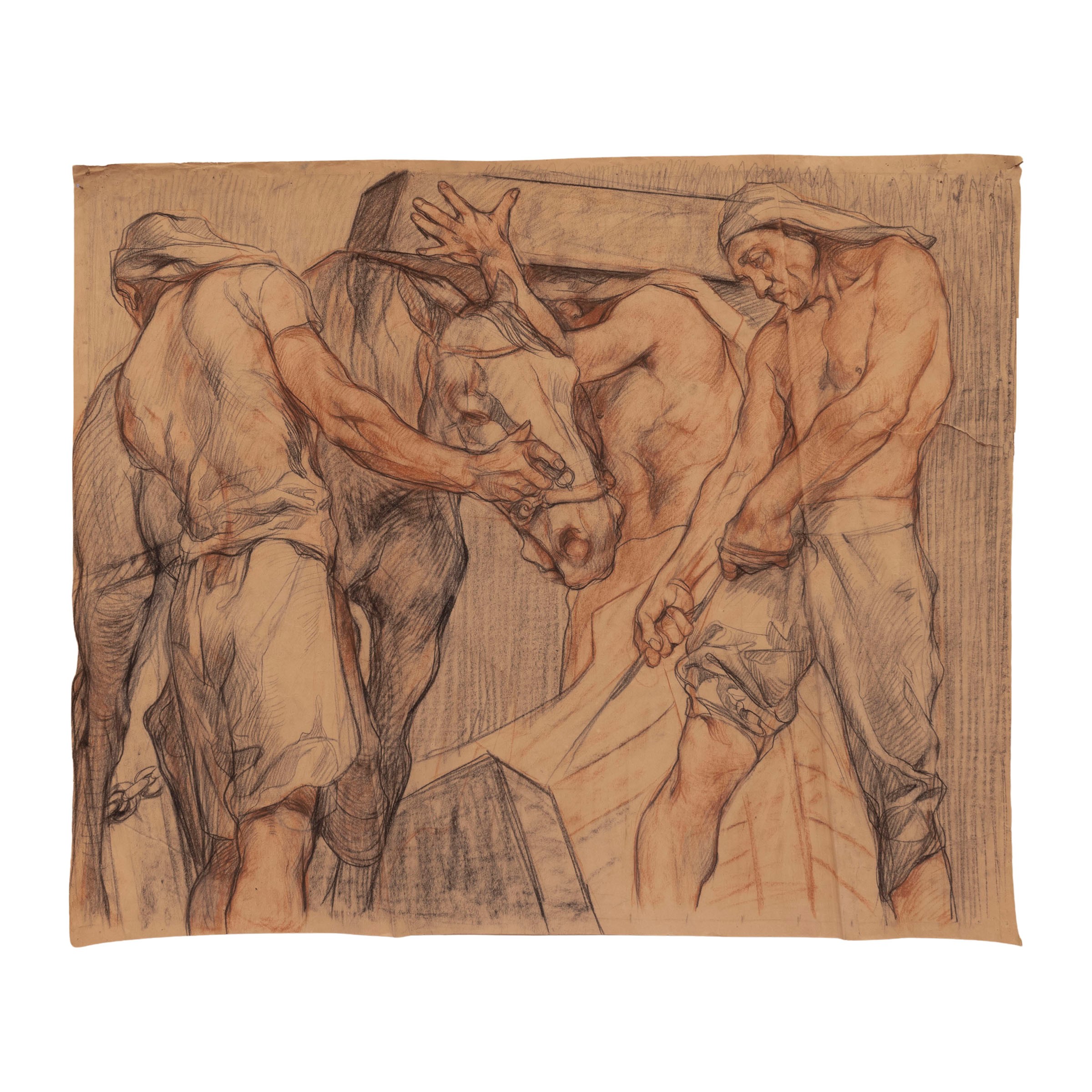 72x88cm.charcoal and sanguigne on paper, titled at the top right, free sheet, the paper has defects
