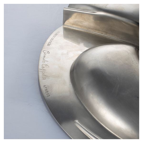 d. 34 cm.Forma Orizzontale Circolare mod. tray in silver metal, signed, production brand, slight wears