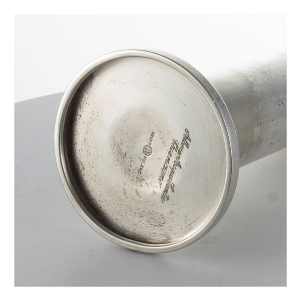 h. 14,5 cm.Silvered metal monofiore vase, production brand, wears