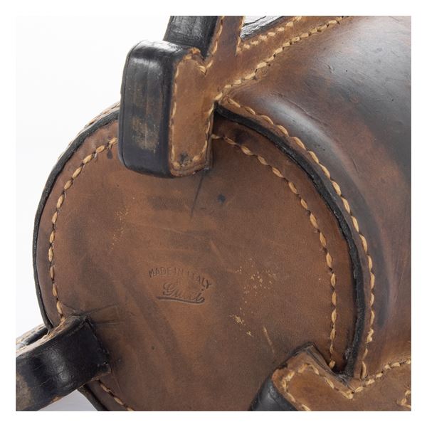 h. 15 cm.leather and silver cup, production brand, wears