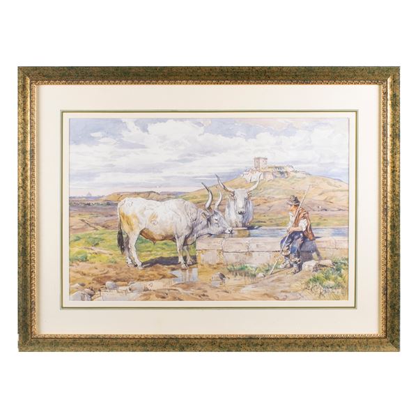 "Shepherd with oxen", watercolor on paper, within frame