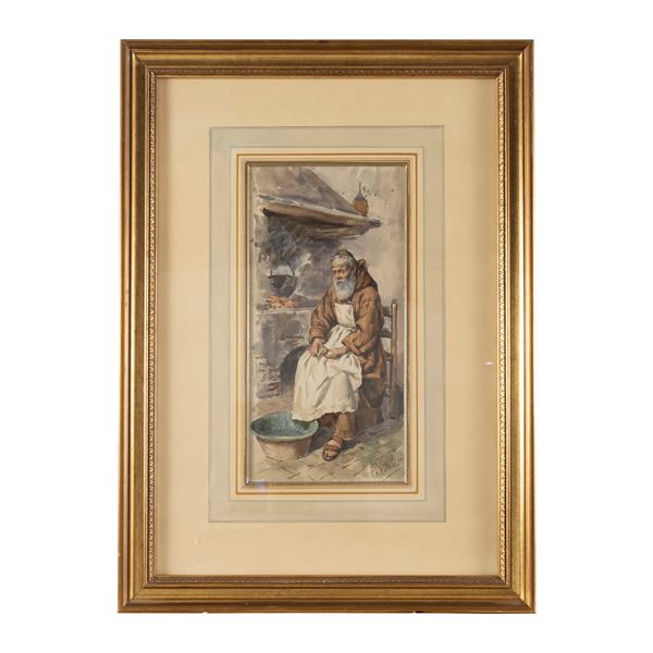 32x16 cm."Friar in an interior", watercolor on paper, signed at the bottom right, within frame