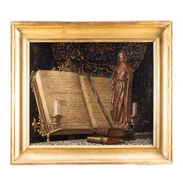 "Still life with book", oil on Masonite, signed at the bottom right, within frame