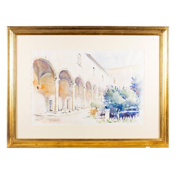 "Cloister of a convent", watercolor on paper, signed and dated 2003 on the bottom left, within frame