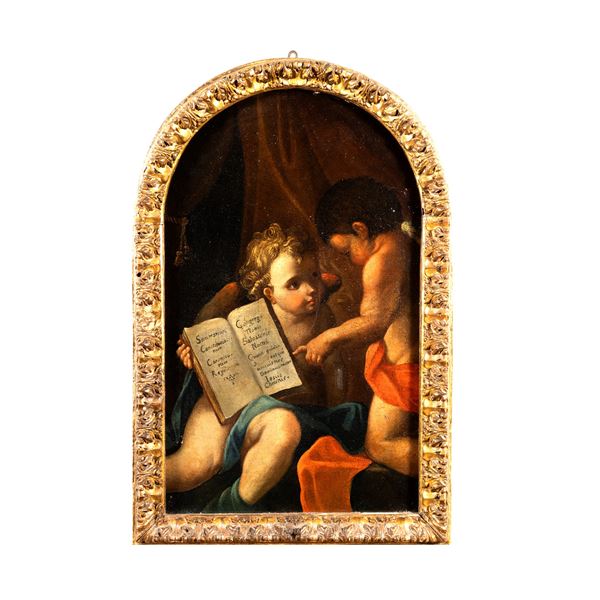 "Putti with the rule of Sant'Agostino", oil on panel, within frame