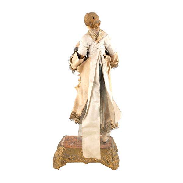 h. 40cm."Georgiana", nativity scene sculpture in polychrome terracotta, wood and fabric, resting on a rectangular base, defects
