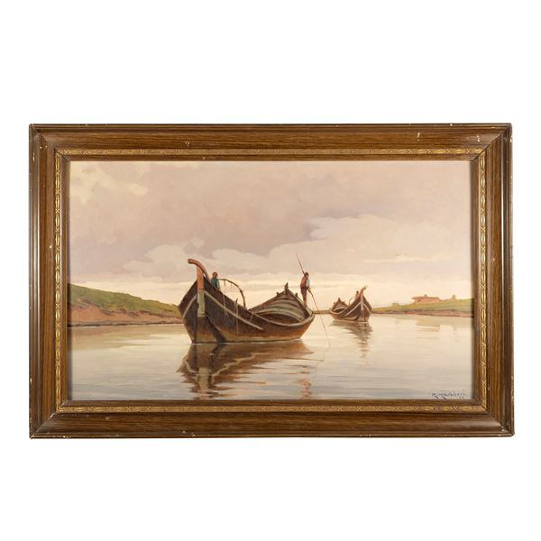 "Fishing at sunset", oil on table, signed at the bottom right, within frame