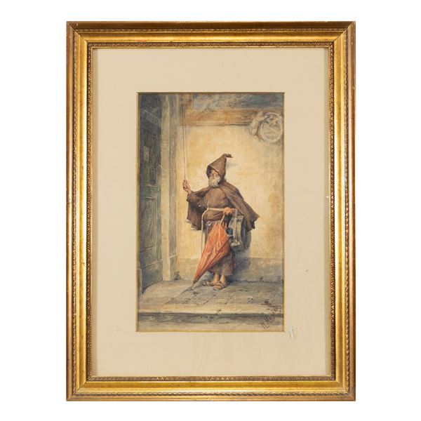 33x21 cm."Friar with umbrella", watercolor on paper, signed at the bottom right, within frame