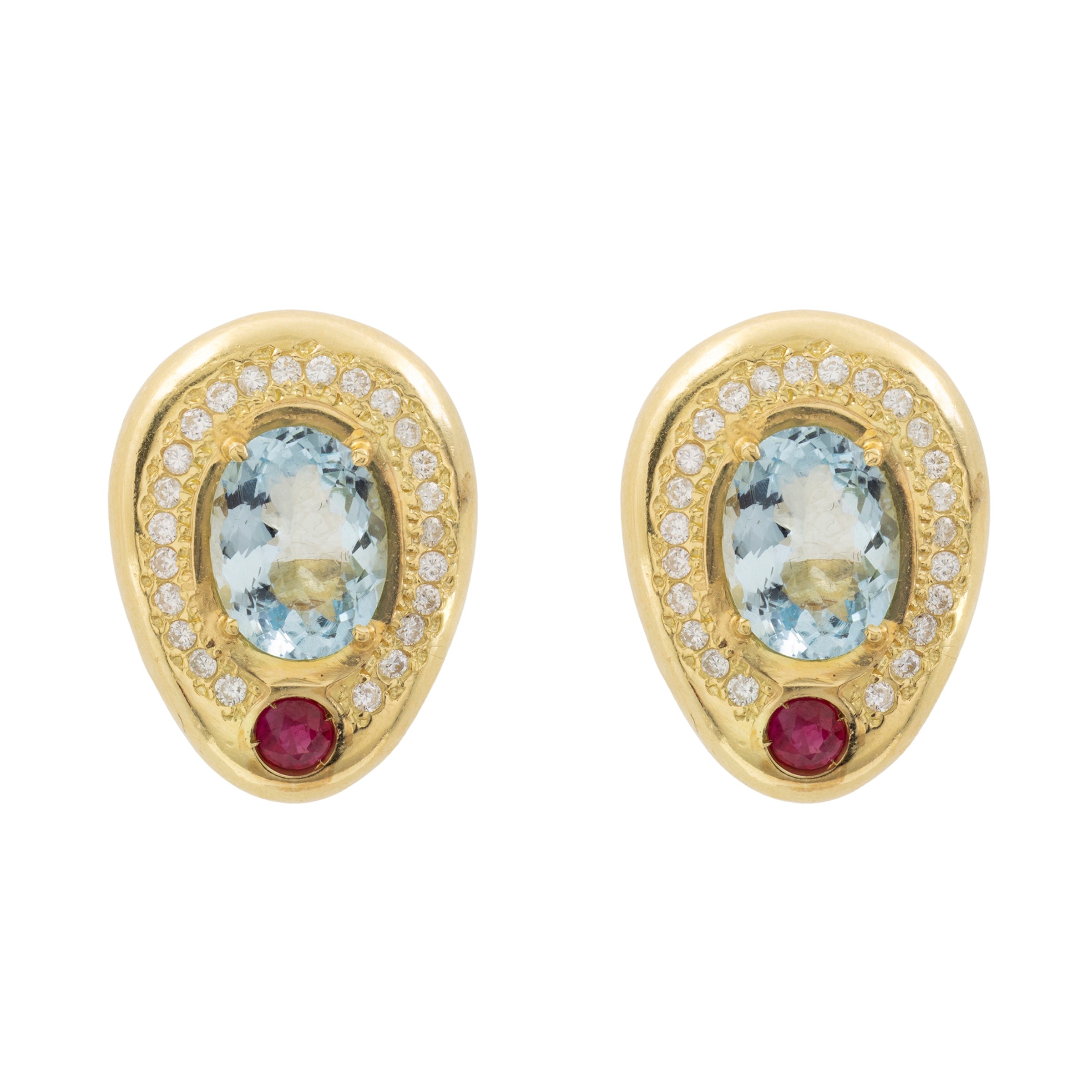 faceted oval cut topaz, brilliant-cut diamonds circa 1.30 ct and two synthetic rubies, dimensions 2.6x1.9 cm.
