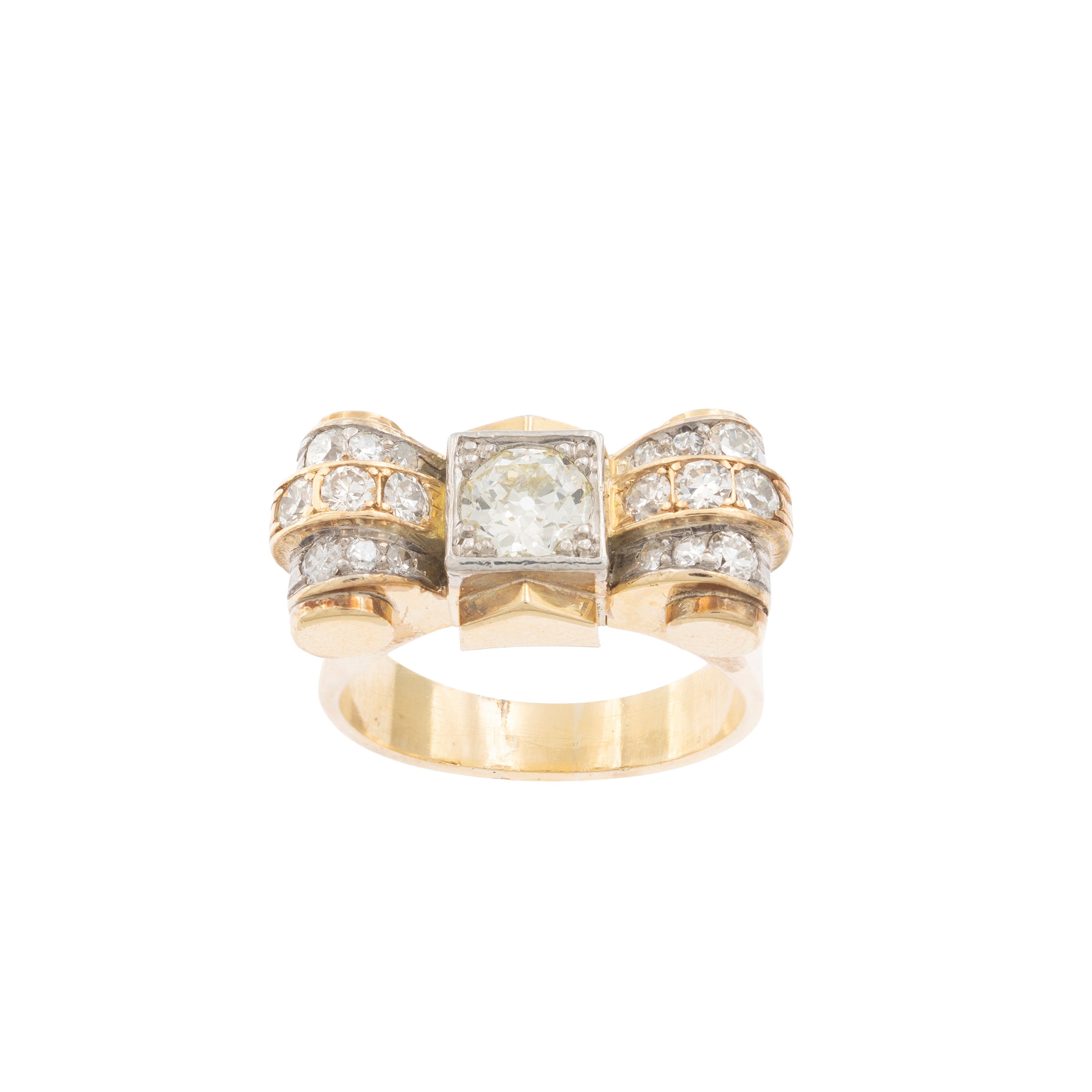 weight 12 g.old mine cut diamond circa 1 ct, on the sides antique brilliant cut diamonds circa 0.90 ct, size 24