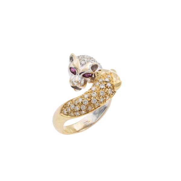 brilliant-cut diamonds circa 0.80 ct, eyes with marquise-cut rubies, size 14.5