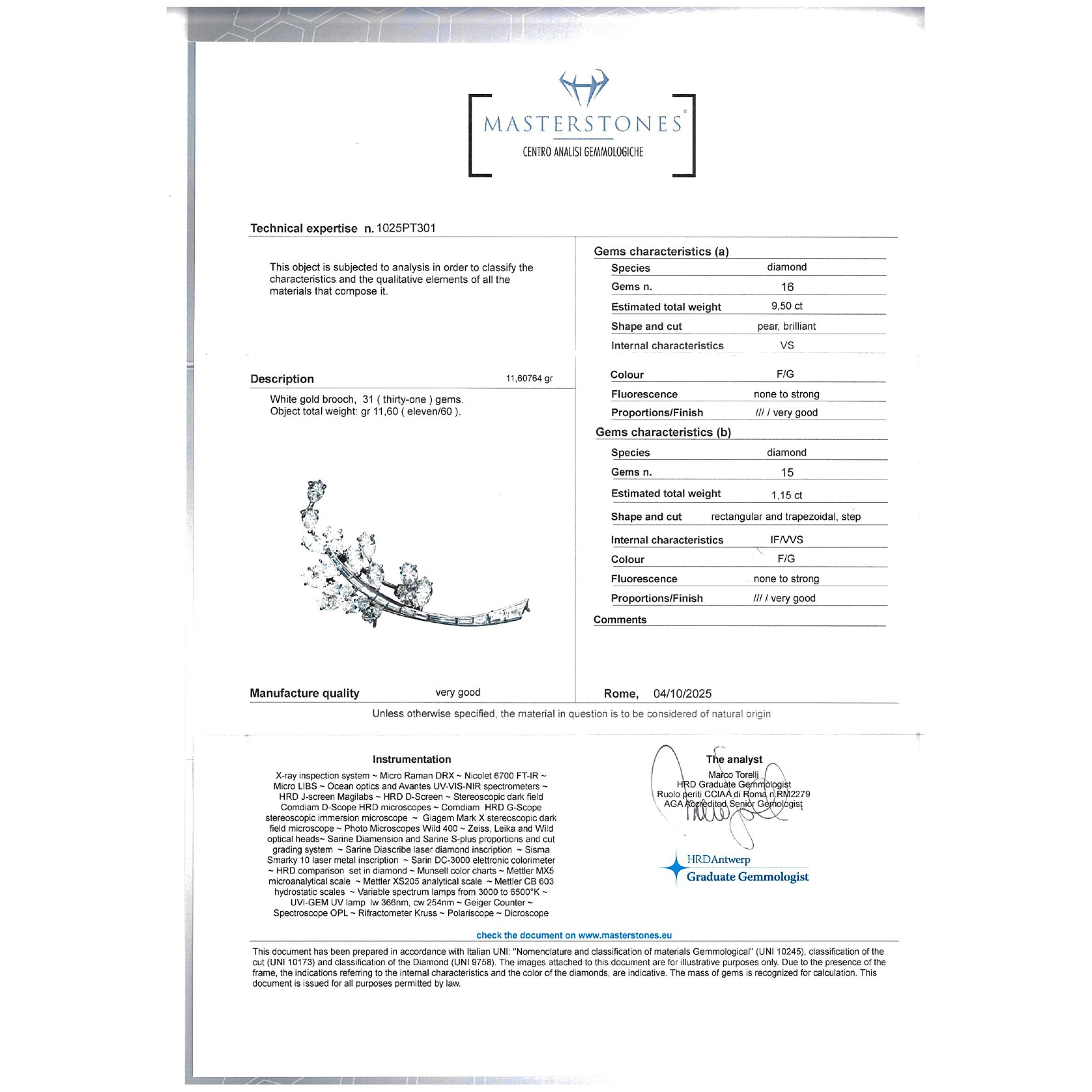16 pear-cut diamonds circa 9.50 ct, F/G color - VS clarity, 15 rectangular and trapezoid-cut diamonds circa ct 1.15, F/G color - IF/VVS clarity, dimensions 6x2.2 cm. complete with gemological certificate