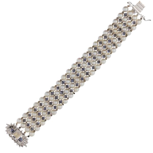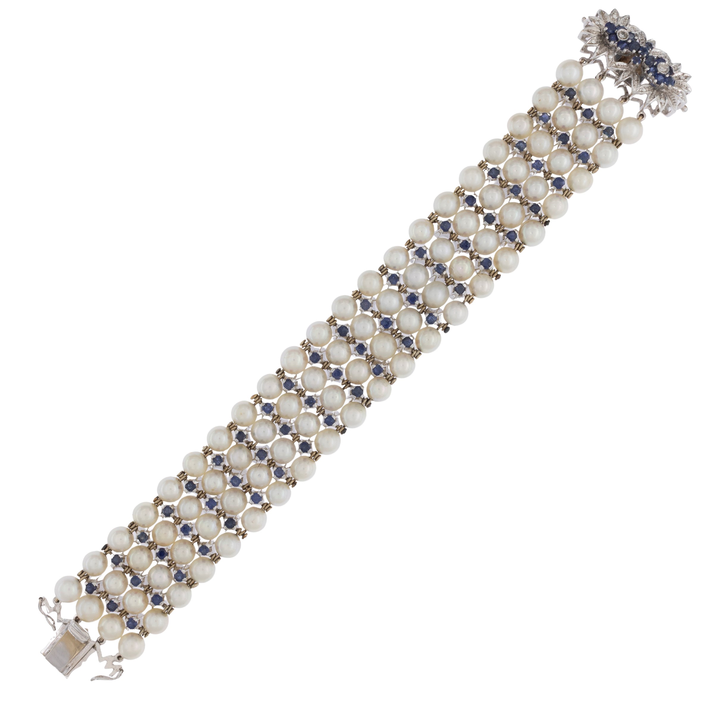 round pearls circa 6 mm pearls. round sapphires circa 2.50, floral motif clasp, length 15 cm.