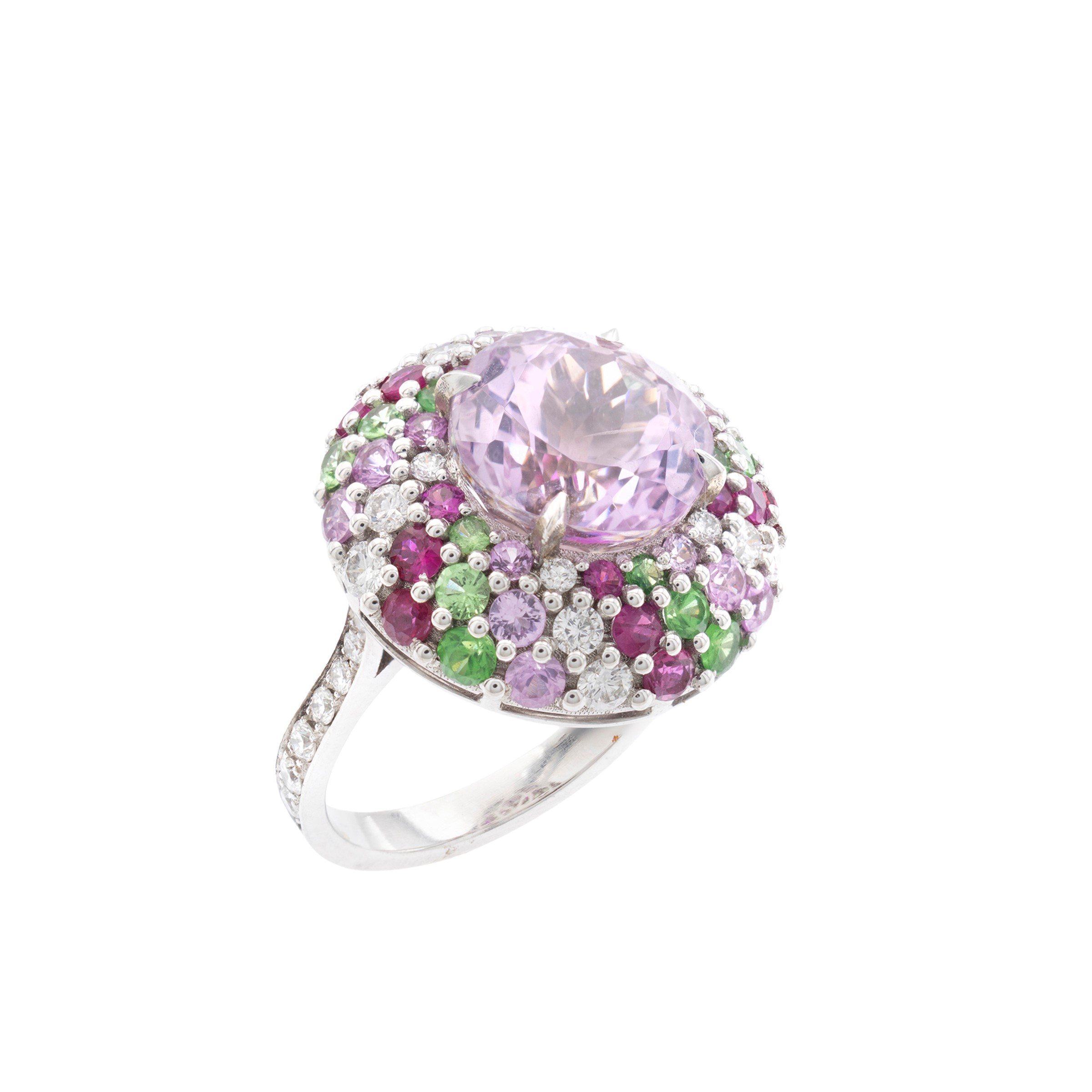 18kt white gold ring with Kunzite diamonds, rubies and peridots
