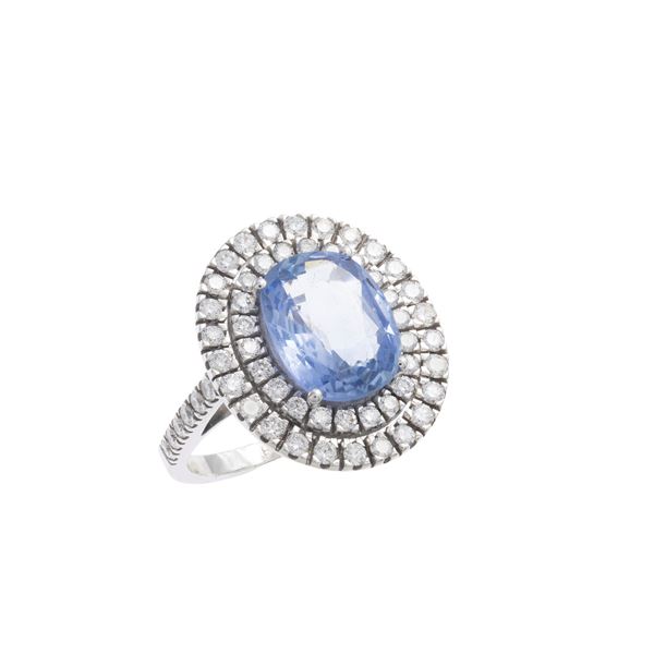 4.60 ct, mixed cushion cut, without heat treatment, surrounded by brilliant cut diamonds circa 1.50 ct, size 13