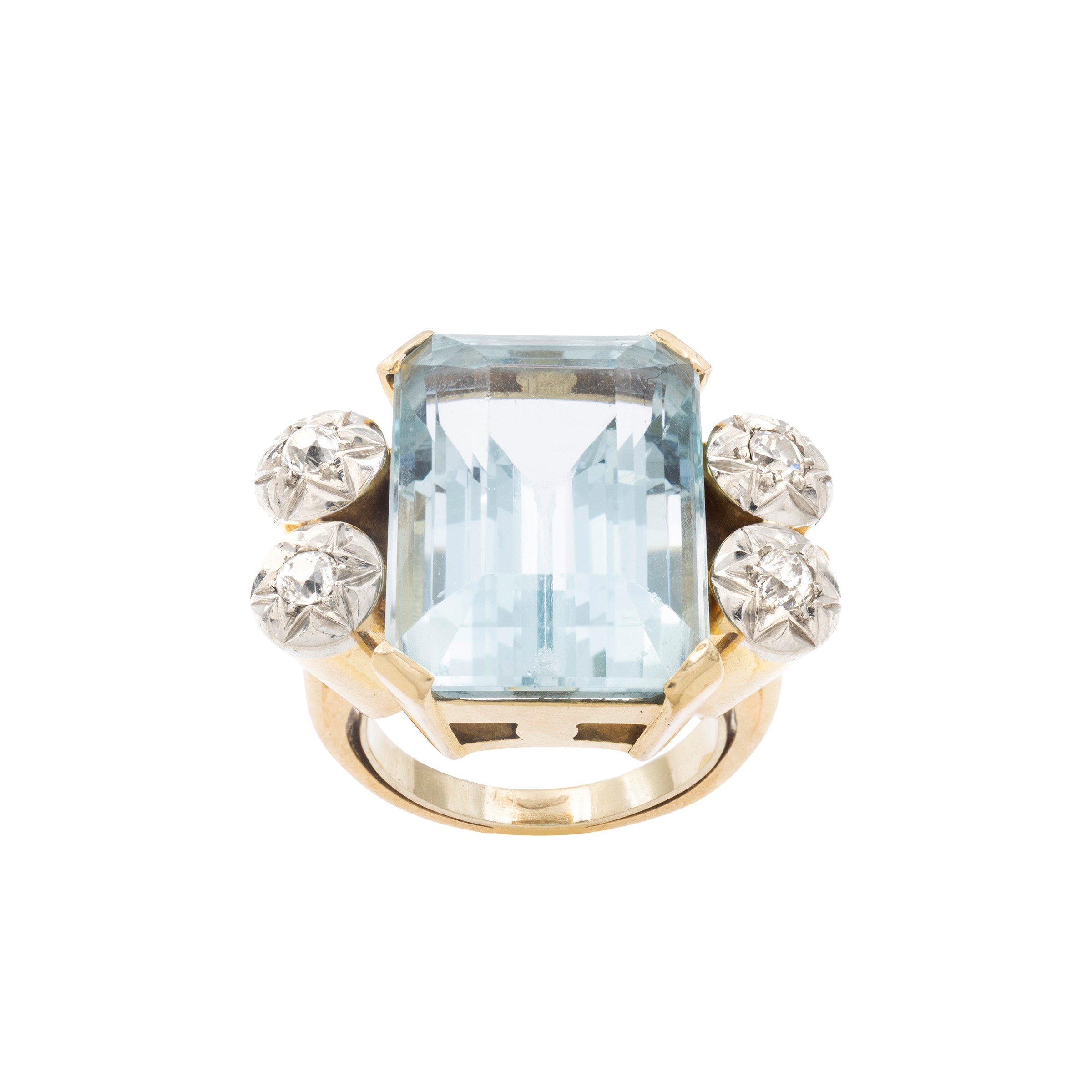 weight 17 gr.octagonal cut circa 14 ct, signs of wear, four brilliant cut diamonds on the sides circa 0.20 ct, size 13