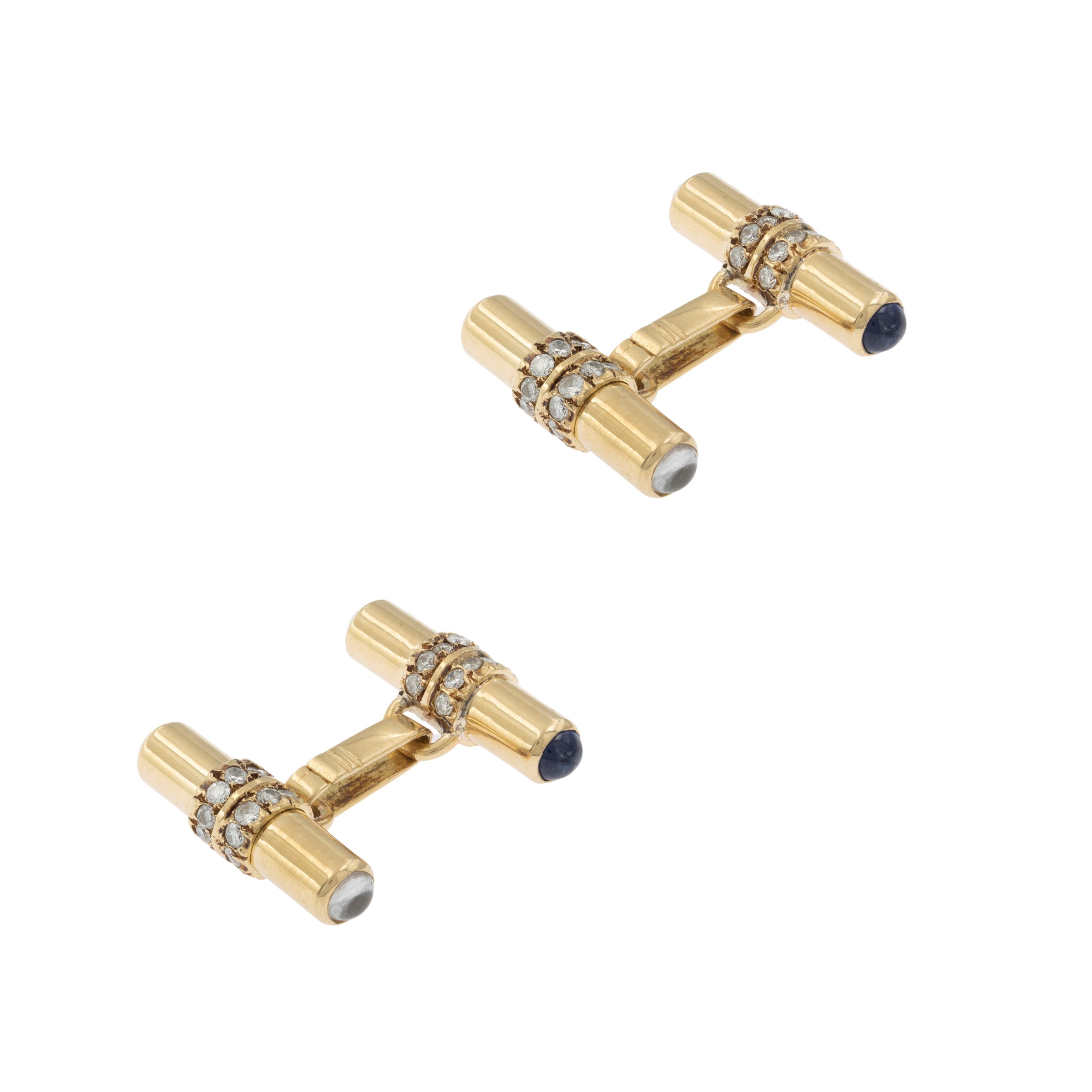 brilliant cut diamonds circa 1 ct, cabochon cut sapphires and quartz, length 2 cm.
