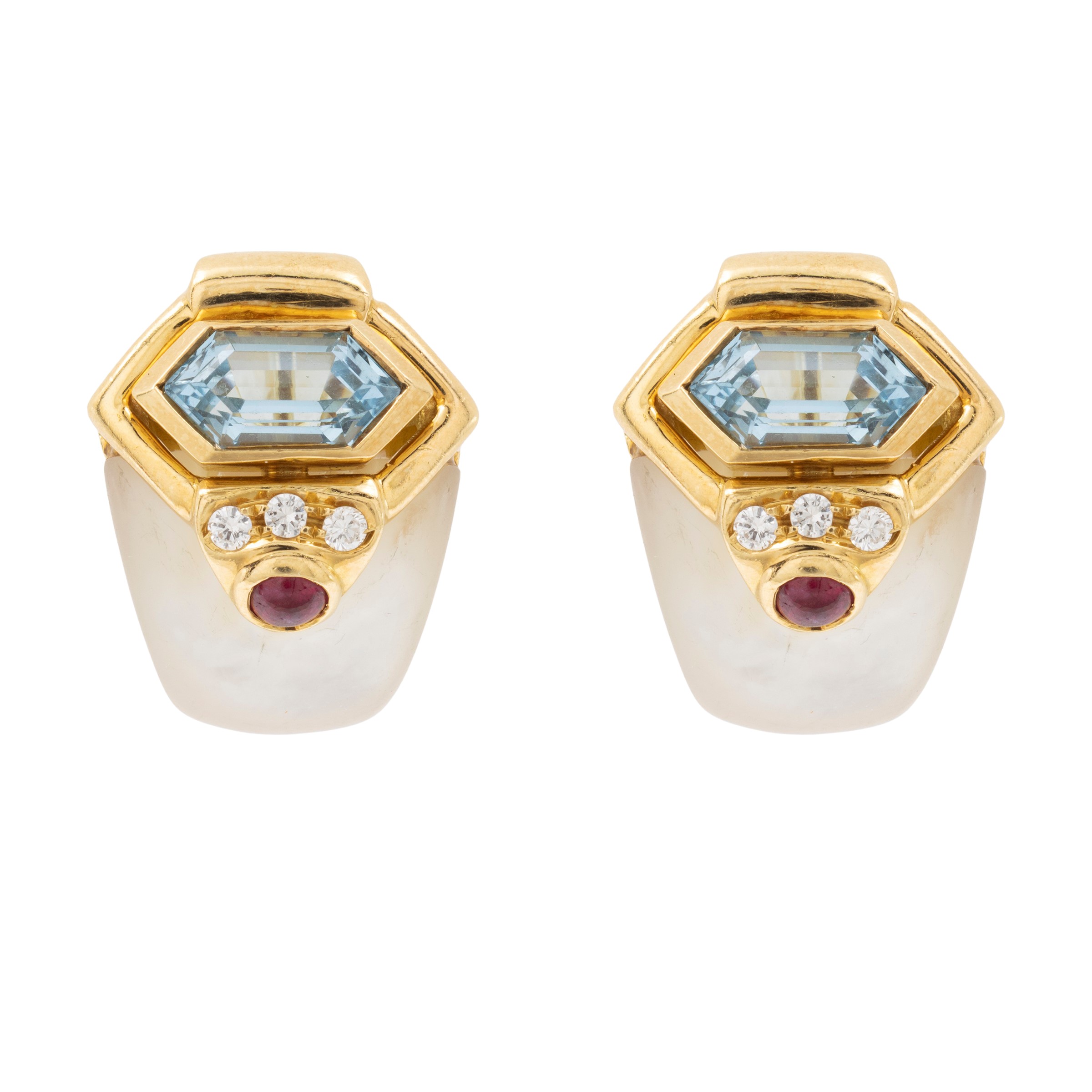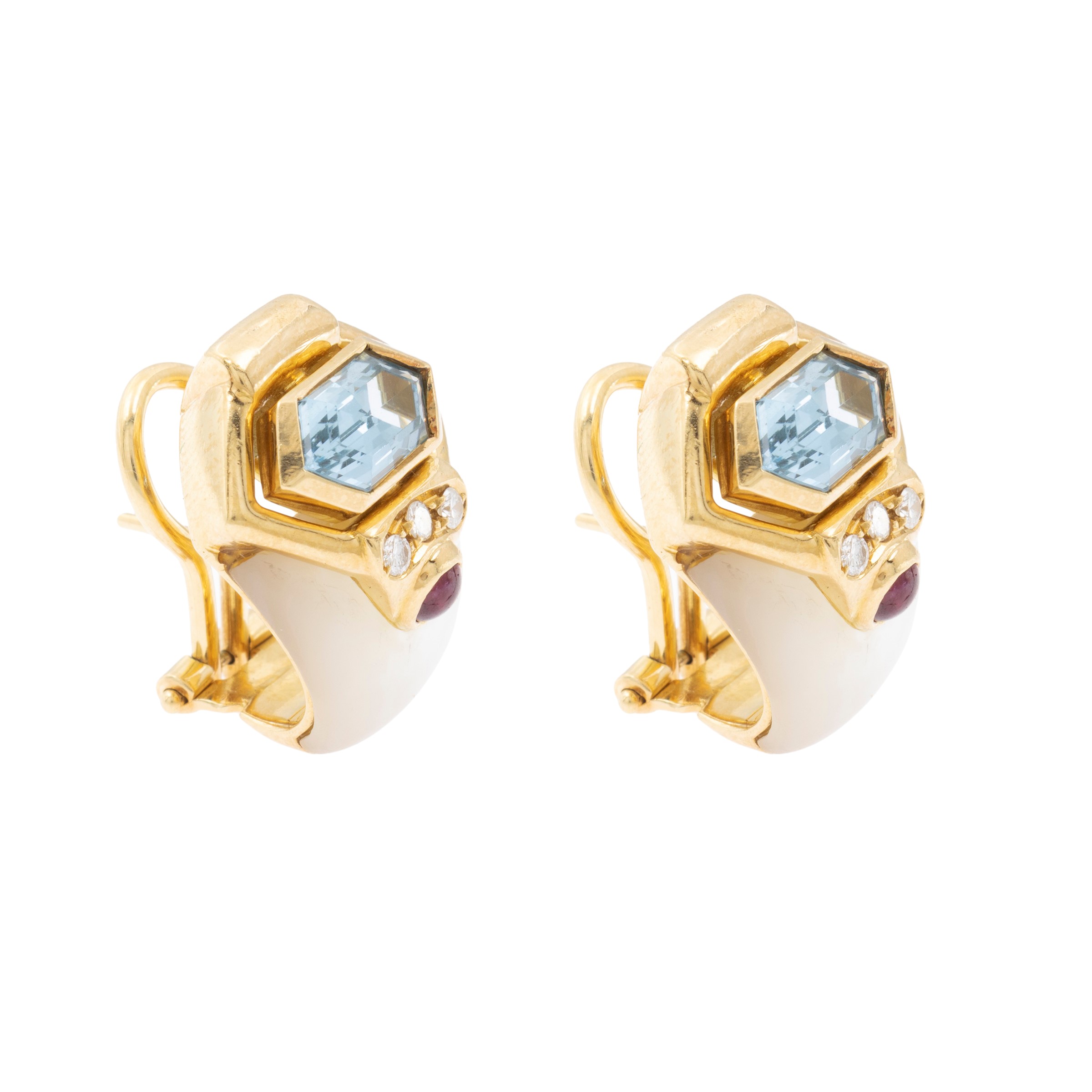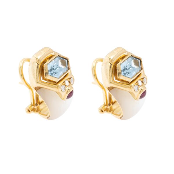 weight 20 gr.two blue topazes, brilliant-cut diamonds circa 0.15 ct and two cabochon-cut rubies, dimensions 2.2x1.5 cm.