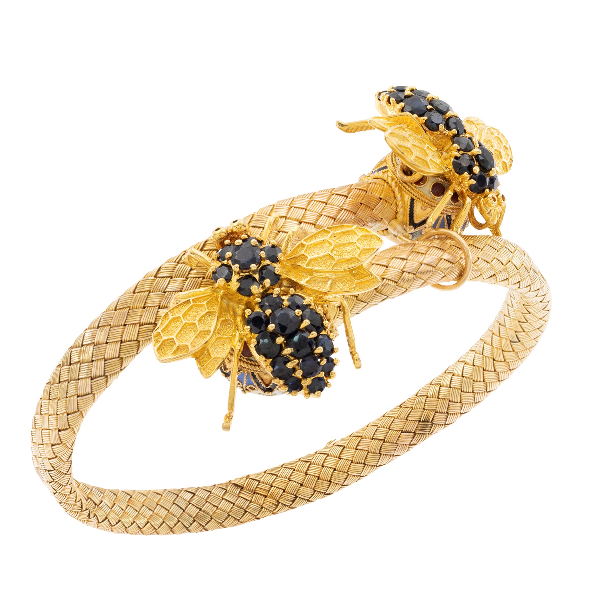weight 36 gr.spheres terminals decorated with polychrome enamels and two bees in yellow gold and round sapphires, adjustable size diameter 6 or 7 cm. slight signs of wear