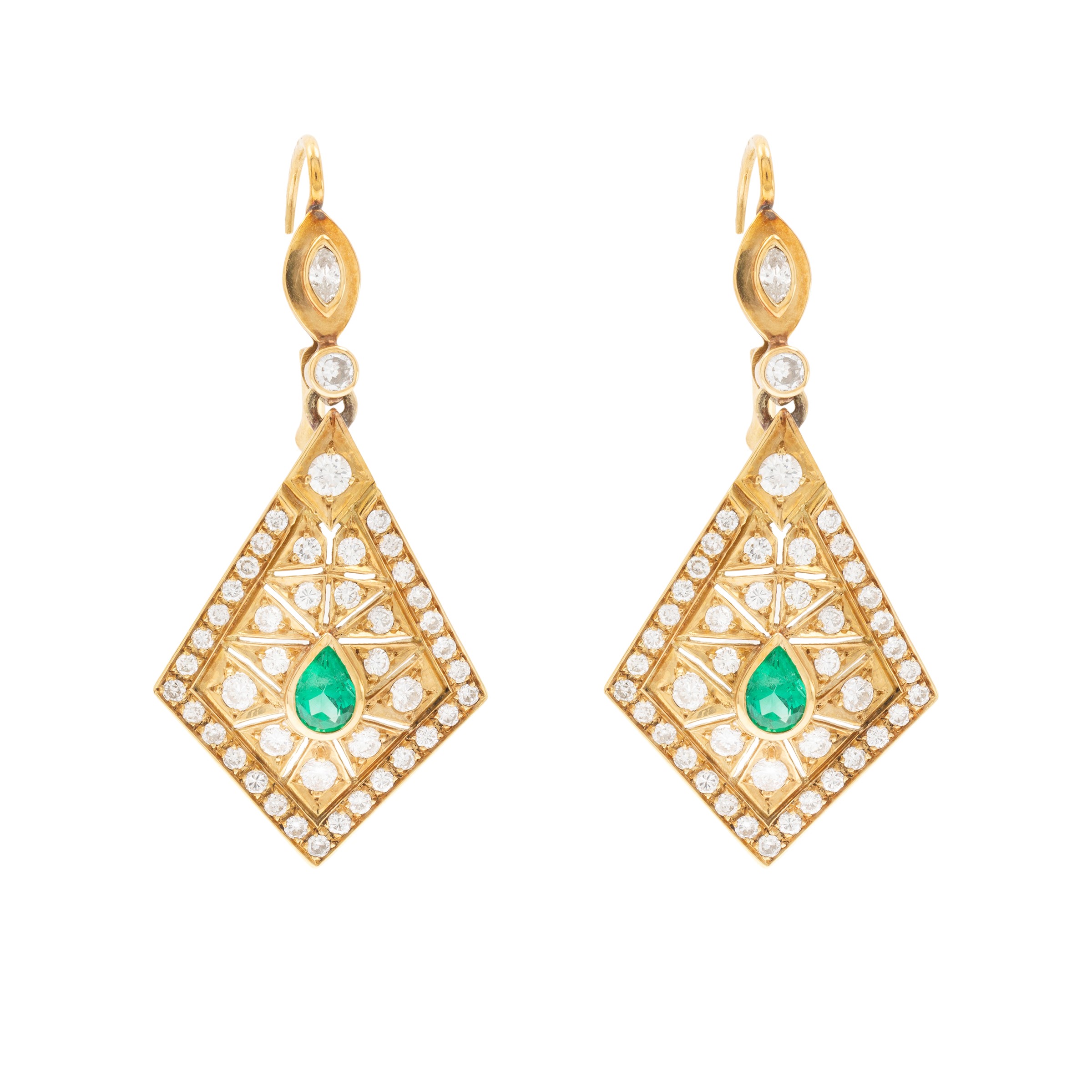 weight 14 gr.brilliant-cut diamonds circa 2 ct, two pear-shaped emeralds circa 0.80 ct, length 5 cm.