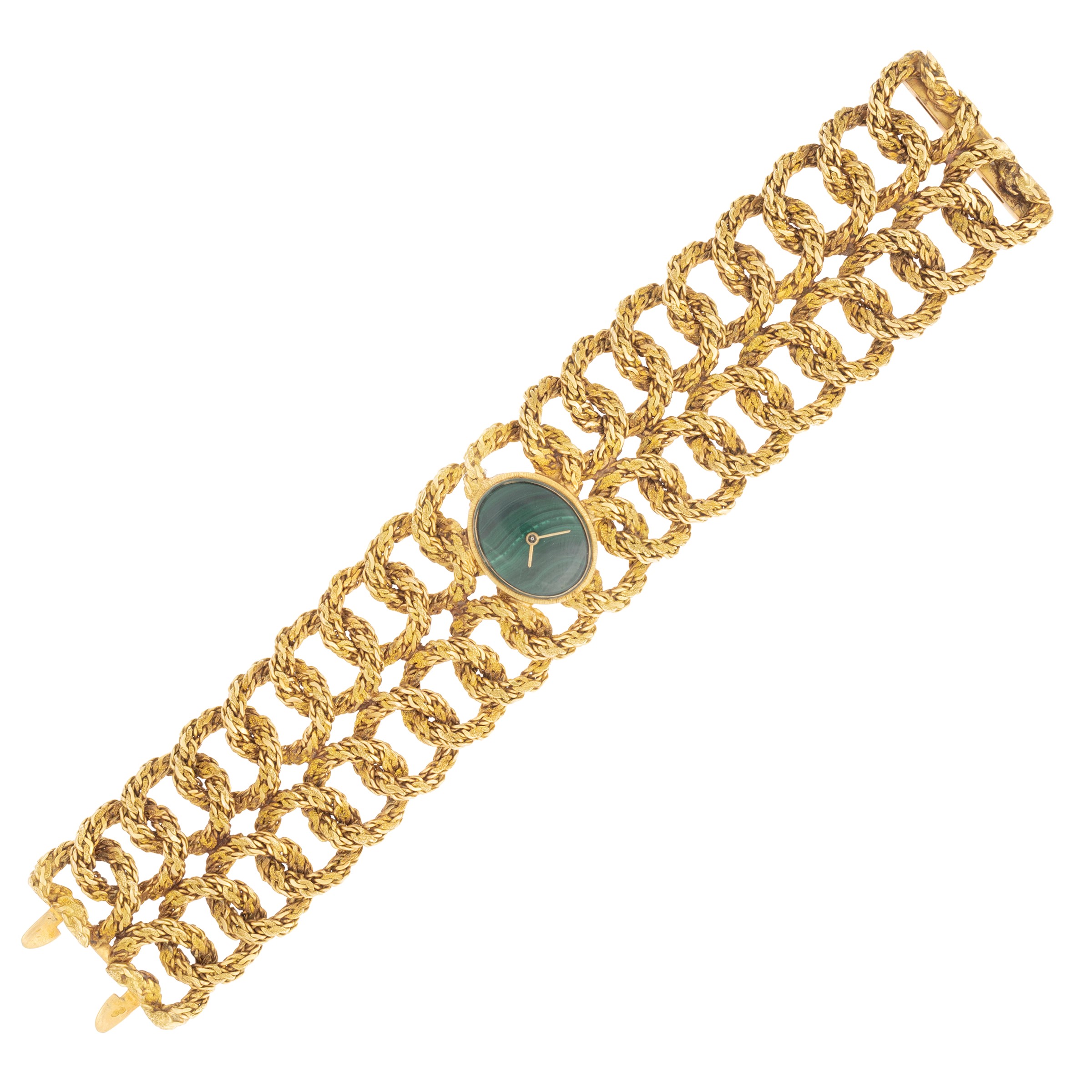 weight 125 gr.oval case 21x17 mm. malachite dial without indexes, mechanical movement with manual winding, links bracelet with concealed clasp, length 18 cm. - height 3.3 cm.