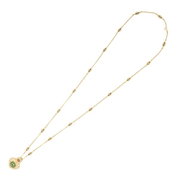 natural oval cut ruby circa 0.70 ct, a natural emerald circa 0.40 ct, round emeralds and brilliant cut diamonds circa 2.50 ct, dimensions 3,3x2,8 cm. Complete with 18kt yellow gold and enamel necklace, length 90 cm.