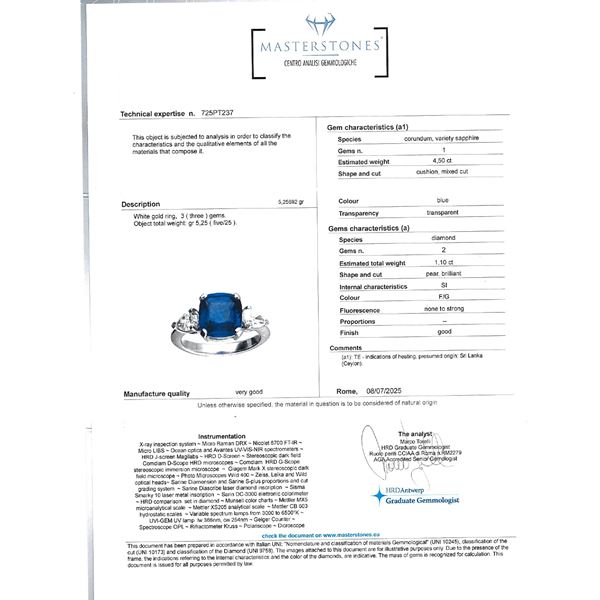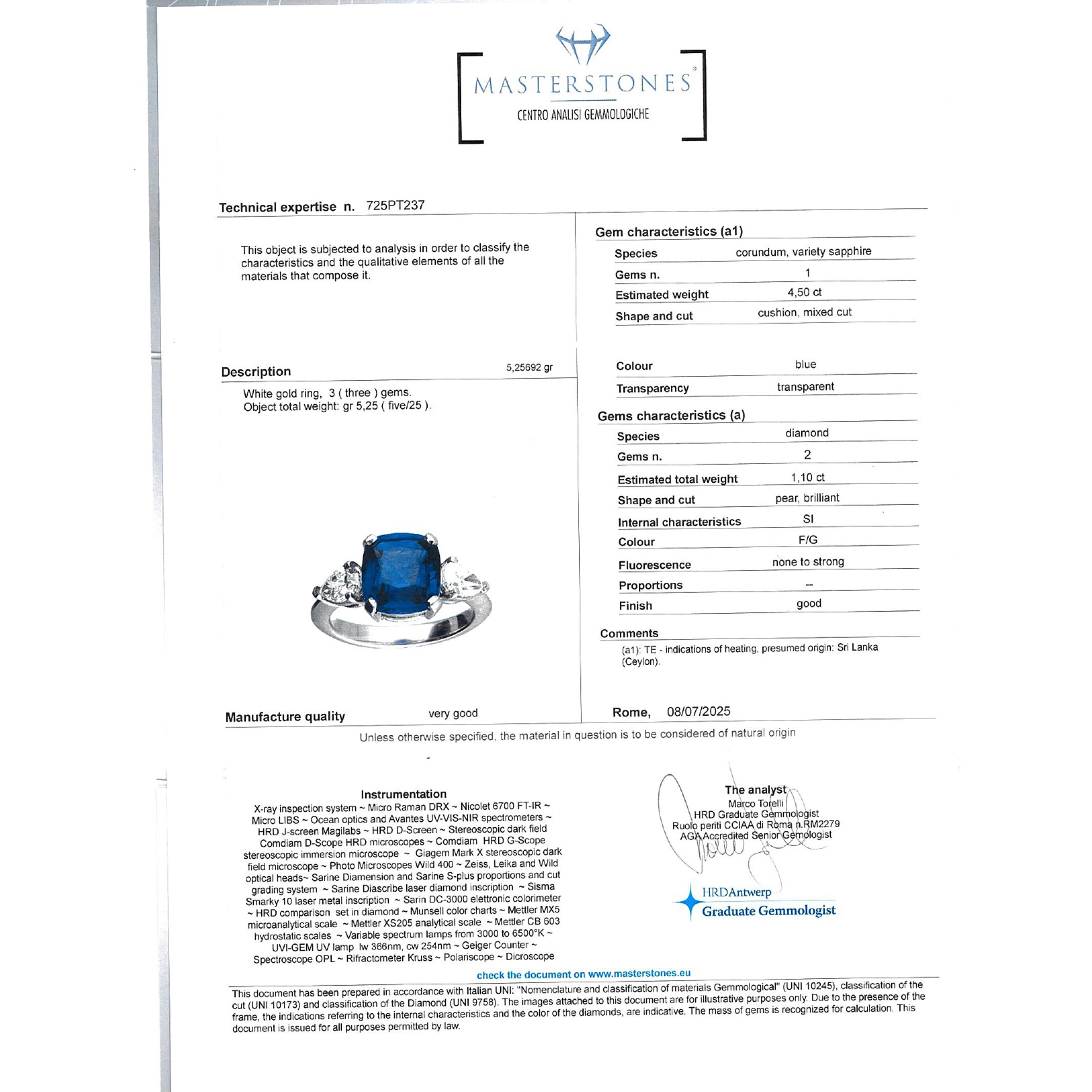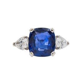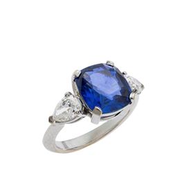 cushion cut sapphire circa 4.50 ct, on the sides two pear cut diamonds circa 1,10 ct, F/G color- SI clarity, complete with gemological certificate, size 12