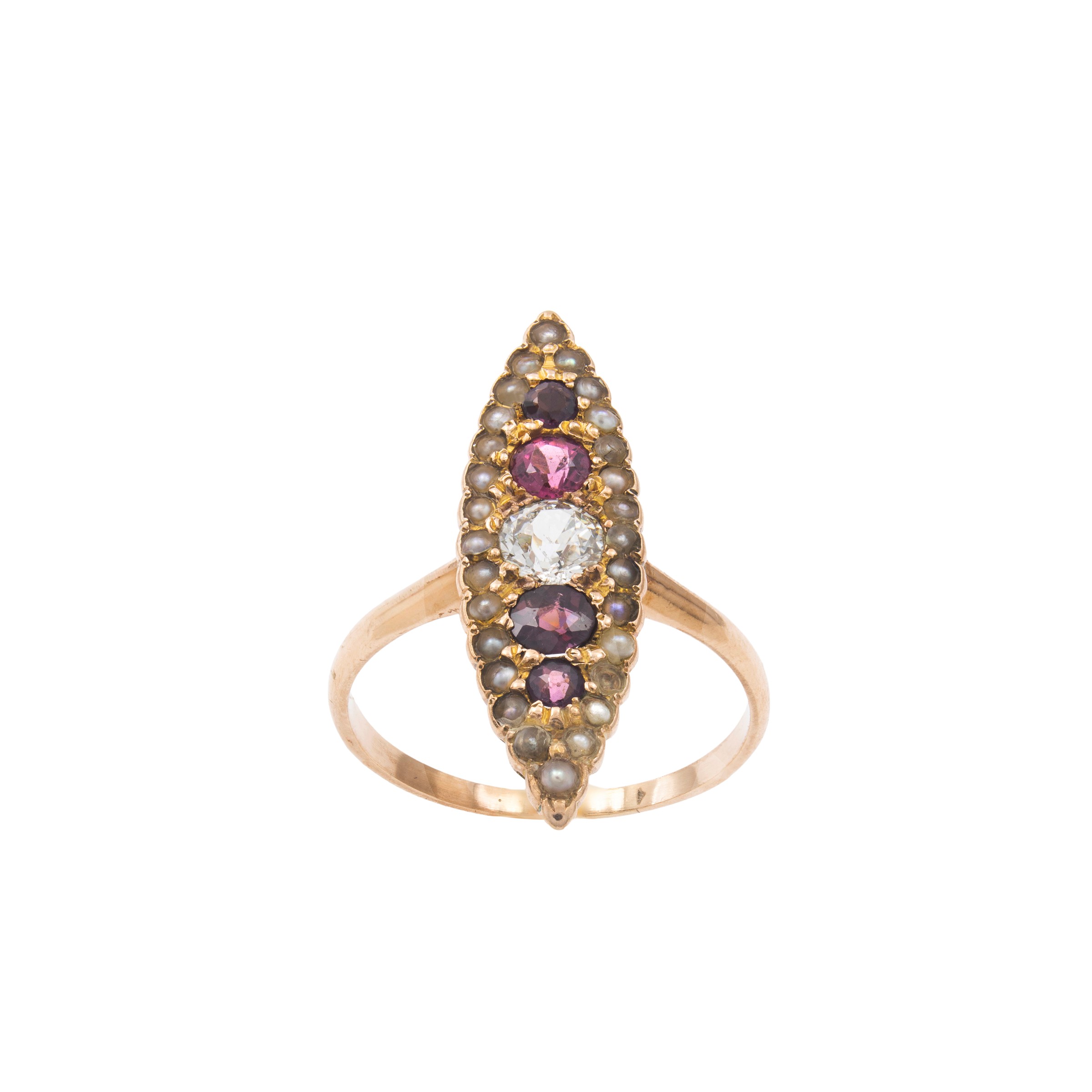 an old mine brilliant cut diamond circa 0.24 ct, garnets and small pearls, size 18